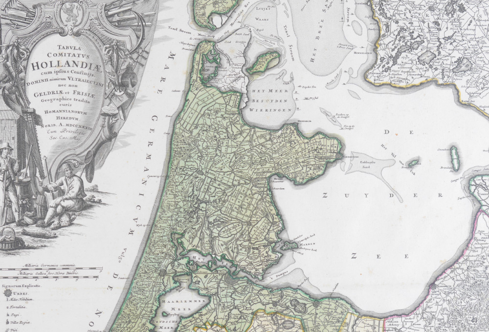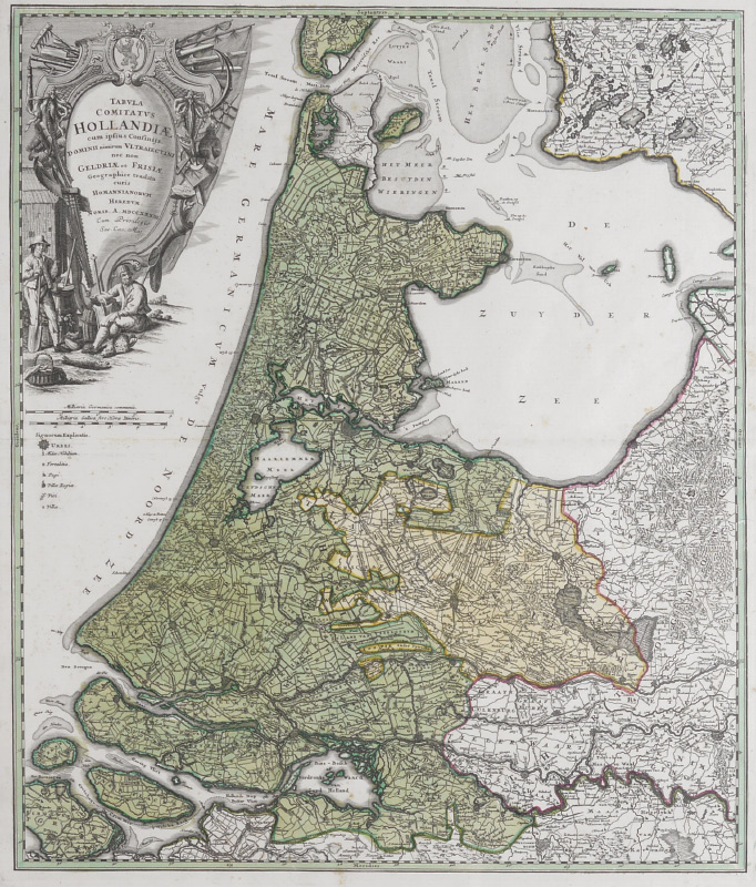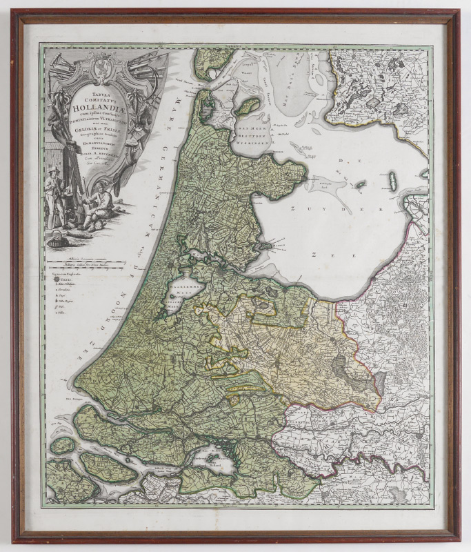 HOMANN, Johann Baptist, (German, 1664-1724): Map after Homann, circa 1733, Nuremburg, ''Tabula Comitatus Hollandiae'', partially hand colored engraving. Cartouche upper left. Plate size 23 1/4'' x 19 3/4'', framed, 25 3/4'' x 21 3/4''.