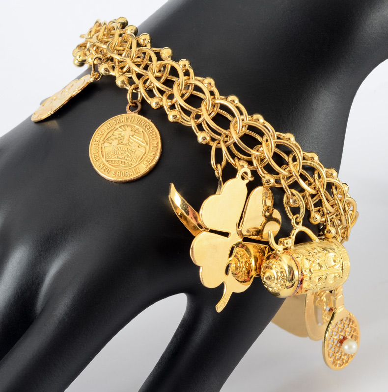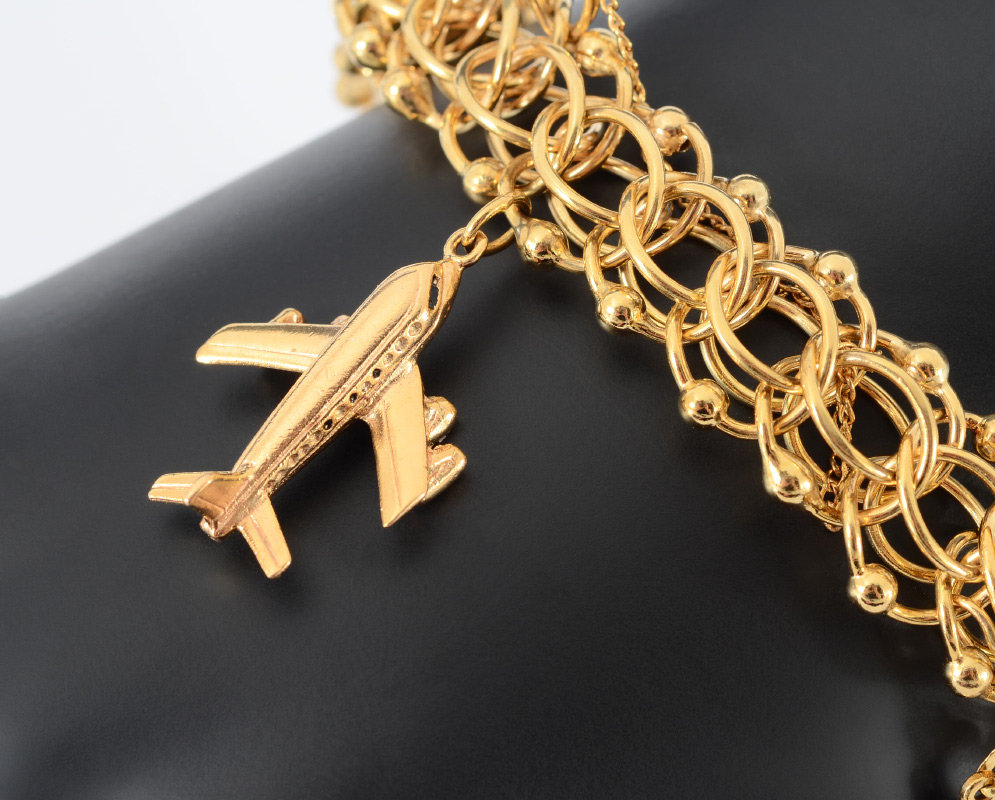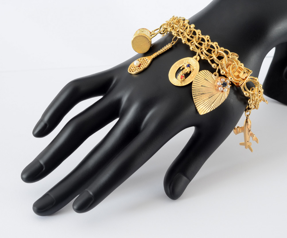 14K GOLD CHARM BRACELET AND CHARMS: Triple circle charm bracelet with 9 charms attached, including an airplane, tennis racket, hearts and a working stein. Charms containing natural and synthetic gemstones. Length 8''. Width .5''. Weight: 60.1 grams.