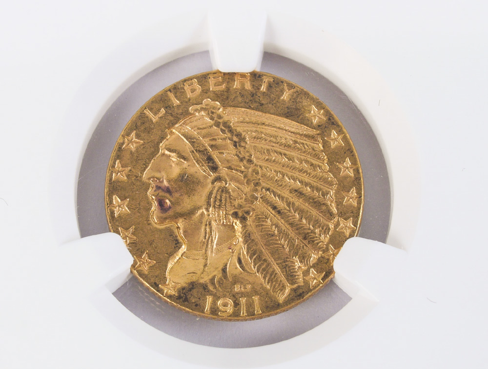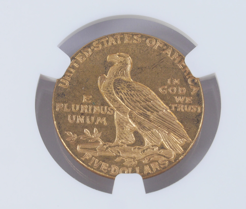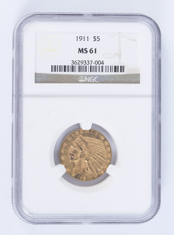 1911 US INDIAN HEAD $5 GOLD COIN: Slabbed and graded NGC MS61.