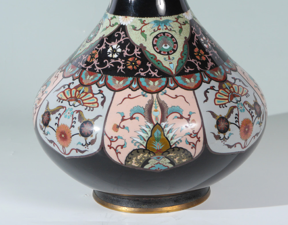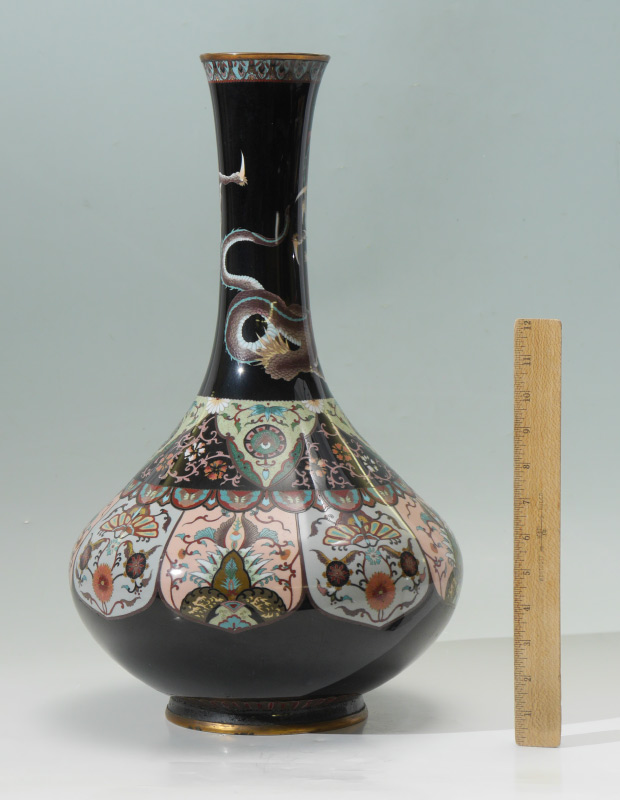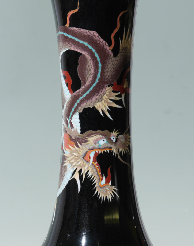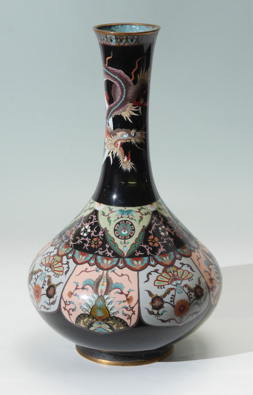 LARGE MEIJI JAPANESE CLOISONNE VASE: Black ground with figural dragon on neck, body with alternating panels of floral decoration. Overall measures 19 1/2'' x 11 1/2'' dia.