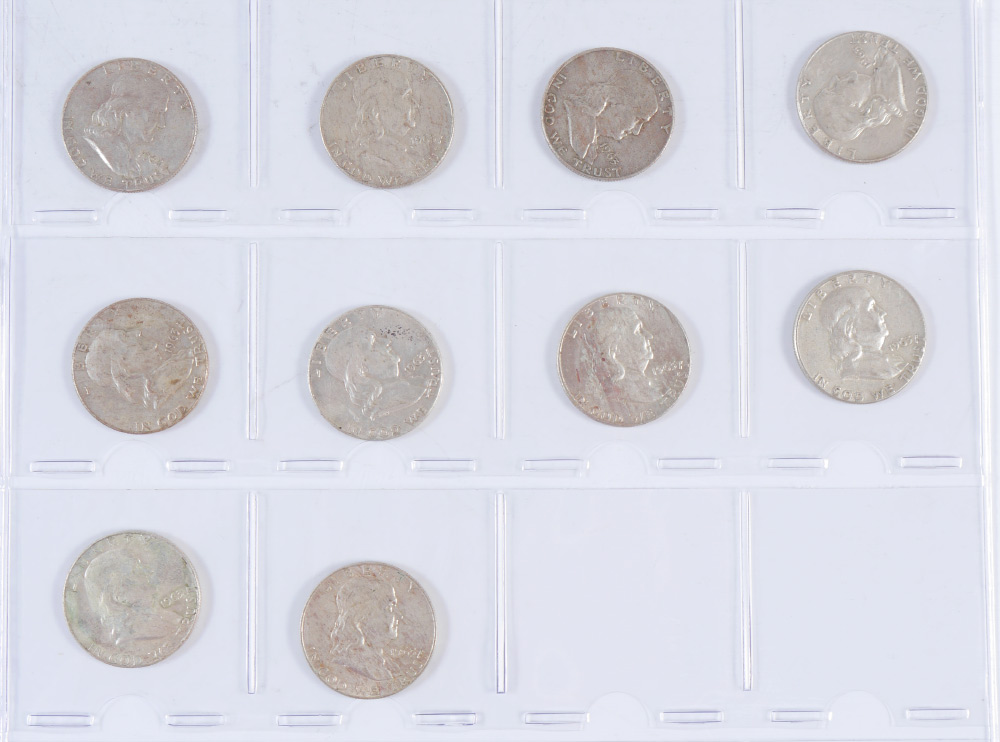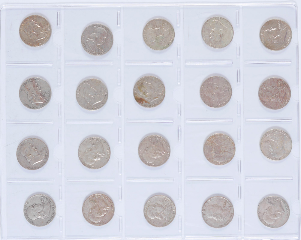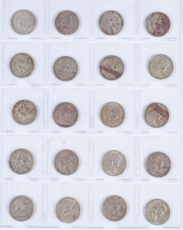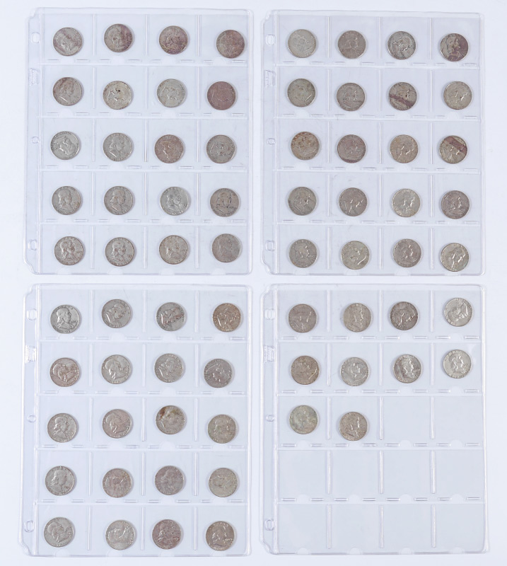 COLLECTION OF BEN FRANKLIN US SILVER HALF DOLLARS: Approx. 70 total to include 4-1950, 9-1951, 14-1952, 5-1953, 6-1954, 5-1957, 2-1958, 4-1959, 5-1960, 4-1961, 3-1962, 9-1963. Ungraded, condition varies.