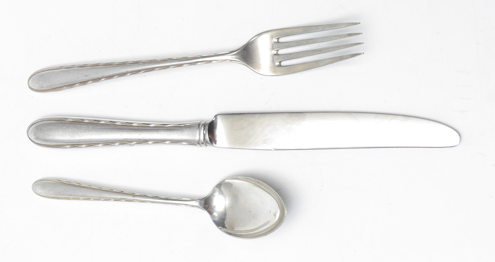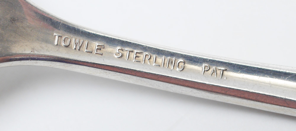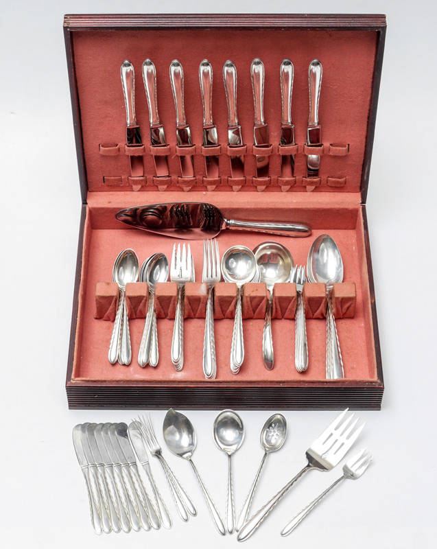TOWLE SILVER FLUTES STERLING FLATWARE: Complete service for 8 approx. 76 pieces in the Silver Flutes pattern by Towle to include 8 forks (7 3/8''), 8 salad forks (6 1/2''), 16 teaspoons (5 7/8''), 8 soup spoons (6 3/8''), 8 hollow knives (8 7/8''), 8 butter knives (5 3/4''), 3 serving spoons (8 1/2''), serving fork (8 1/8''), ladle (6 3/4''), 8 cocktail forks (5 3/4''), pierced spoon (6''), jelly server (6 3/8''), sugar scoop (5 7/8''), 2 lemon forks (5 1/4''), pickle fork (5 3/4''), hollow cake server (10 1/4''). Approx. 73.4 troy oz.