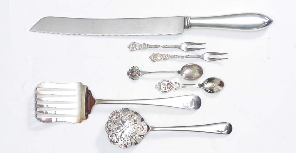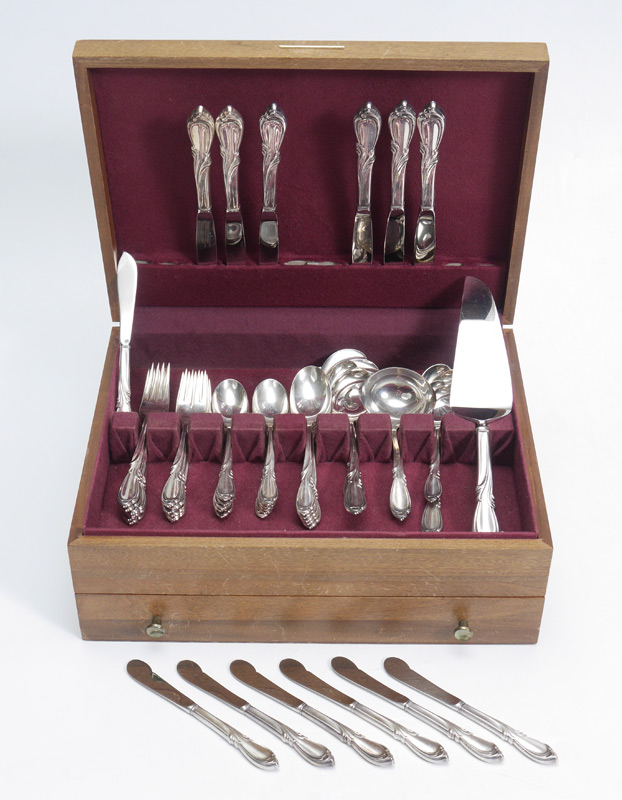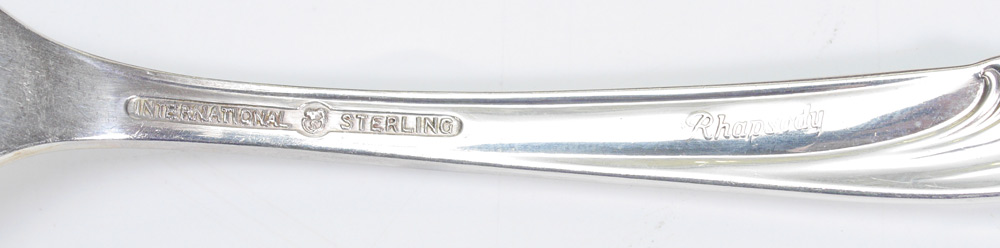INTERNATIONAL RHAPSODY STERLING FLATWARE: Approx. 55 pieces in the Rhapsody pattern by International to include 6 forks (7 1/4''), 6 salad forks (6 1/2''), 12 teaspoons (6''), 6 soup spoons (6 3/4''), 6 hollow knives (9 1/4''), hollow master butter (7''), 6 hollow butter (6 3/8''), tablespoon (8''), pierced tablespoon (8''), serving spoon (8''), sugar spoon (6''), cream ladle (6 1/2''), hollow cake server (10 3/8''). Sold with an additional hollow carving knife by another maker. Approx. 53.4 troy oz. Wood silver chest 5 1/2'' x 14 3/4'' x 11 1/2''.