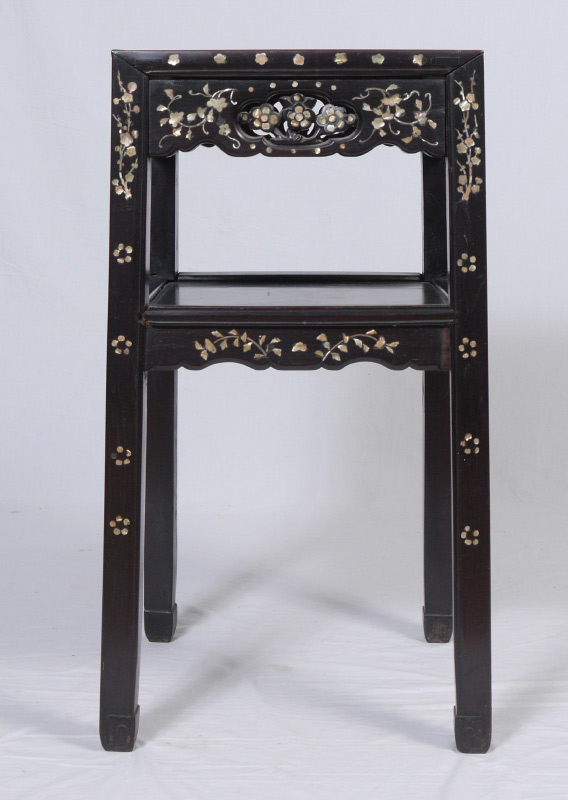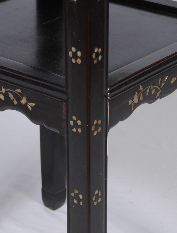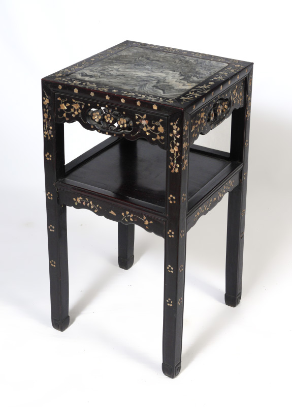 MOTHER OF PEARL INLAID LAMP TABLE: Inset grey marble top, framed with mother of pearl inlaid foliate & floral designs, carved apron, open lower shelf, overall measures 31 3/4'' h. x 16 1/4'' x 16 1/4''.
