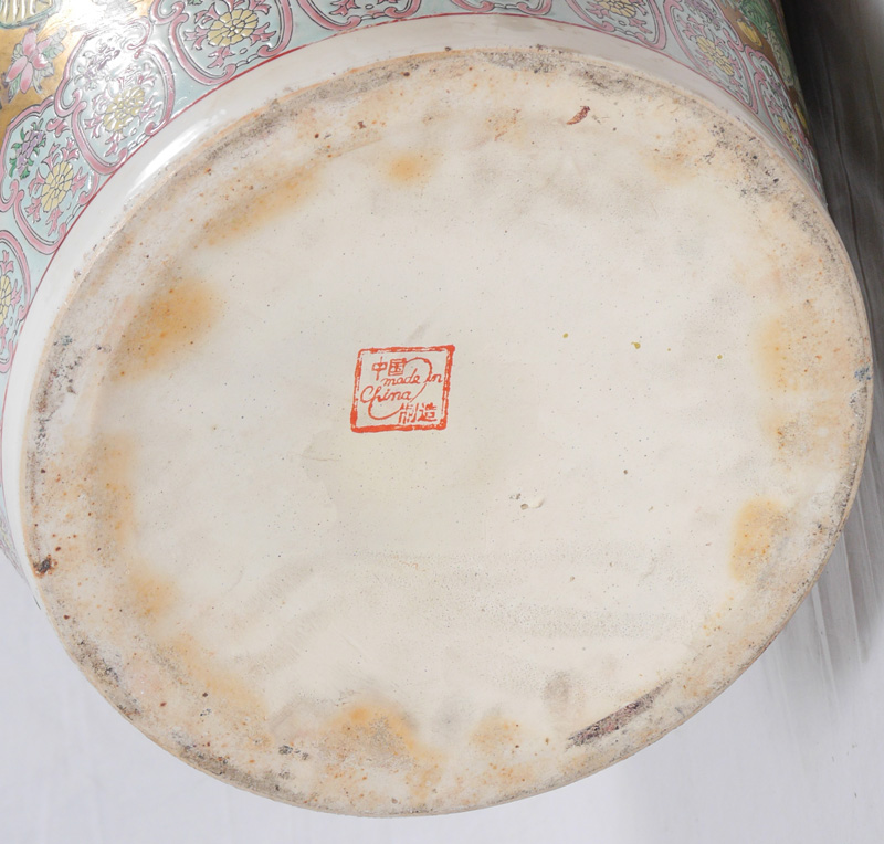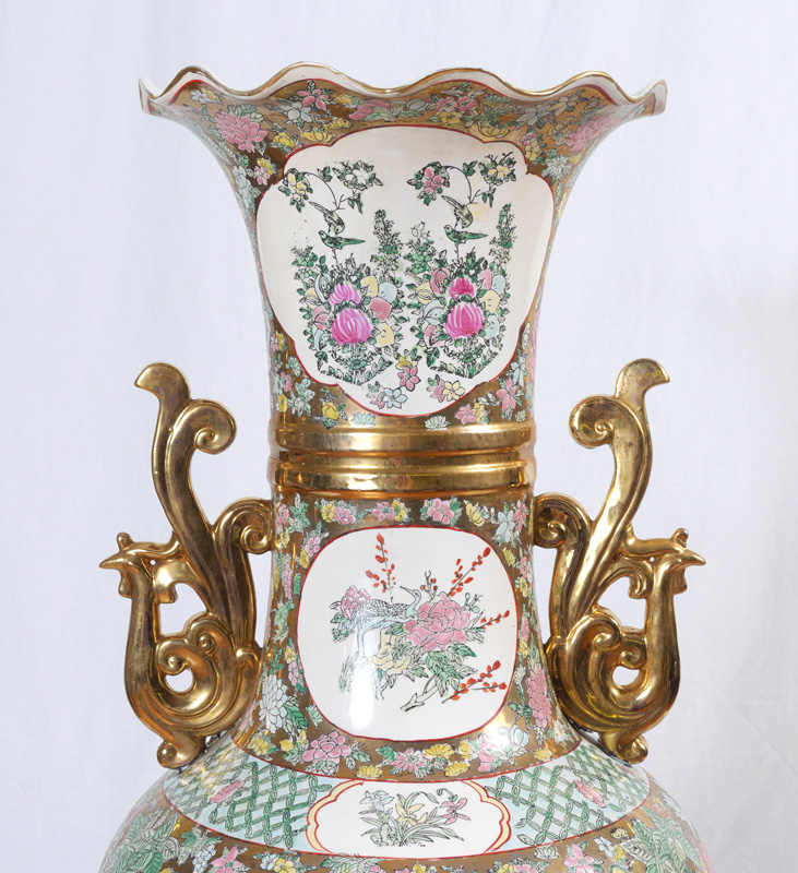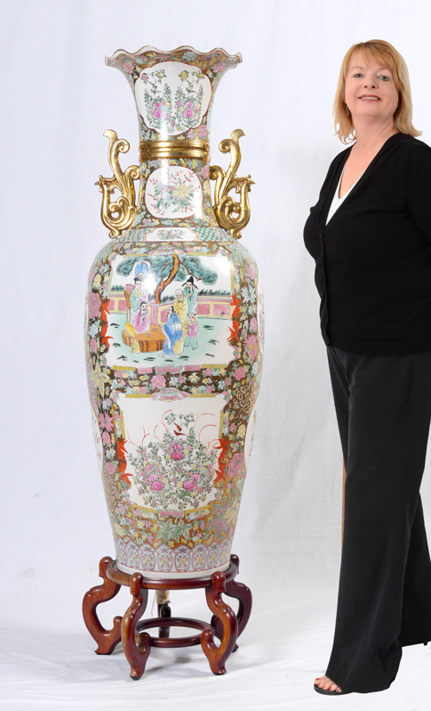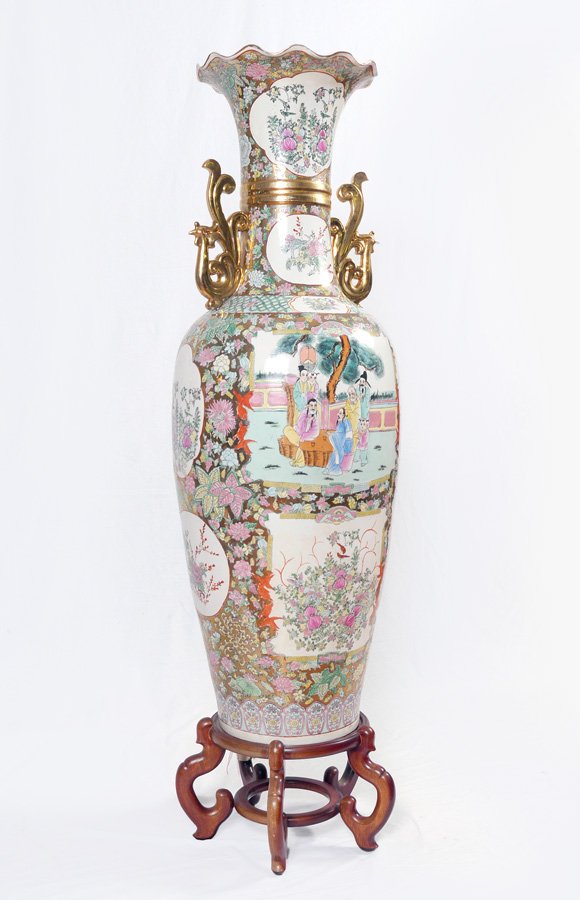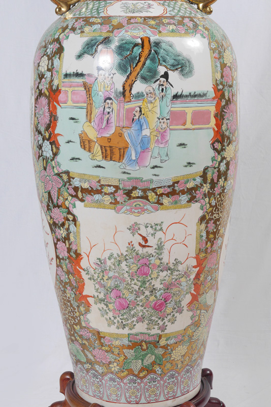 CHINESE ROSE MEDALLION FLOOR VASE & STAND: Palatial floor vase with typical Rose Medallion outdoor genre scenes, floral and gilt decoration. Overall measures 53 1/2'' h. x 18 1/2''. Sold with wood stand, 11'' h. x 18''.