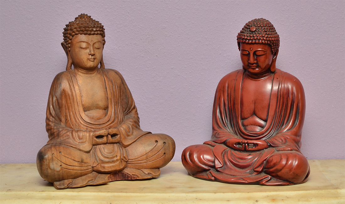 2 PIECE LOT CARVED WOOD & LACQUER BUDDHA: 2 figures of seated Buddha to include 1) Carved wood, measures 11 3/4'' h. x 10'' x 5''. 2) Red lacquer over carved wood, 11 1/2'' h. x 9 1/4'' x 7 1/4''. Actual age unknown.