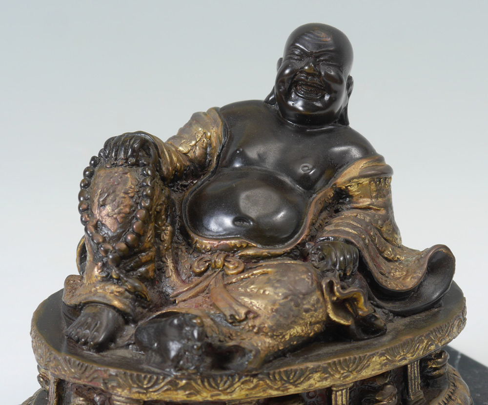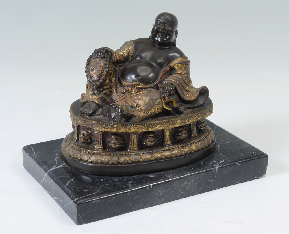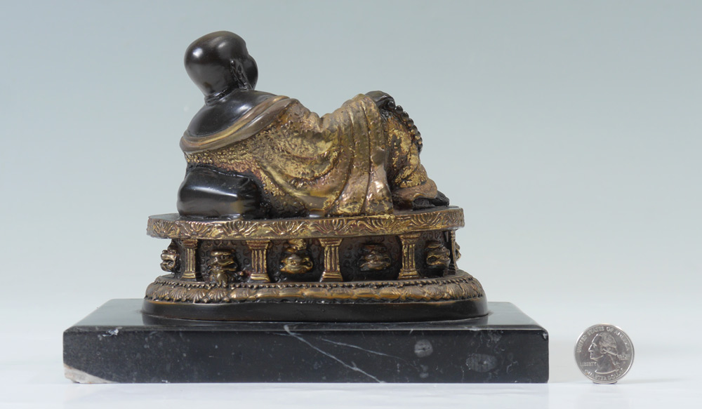BRONZE BUDDHA ON MARBLE BASE: Figure of reclining bronze Buddha on pedestal, affixed to marble plinth, actual age unknown, overall 5 3/4'' h. x 7 1/2'' x 5''.