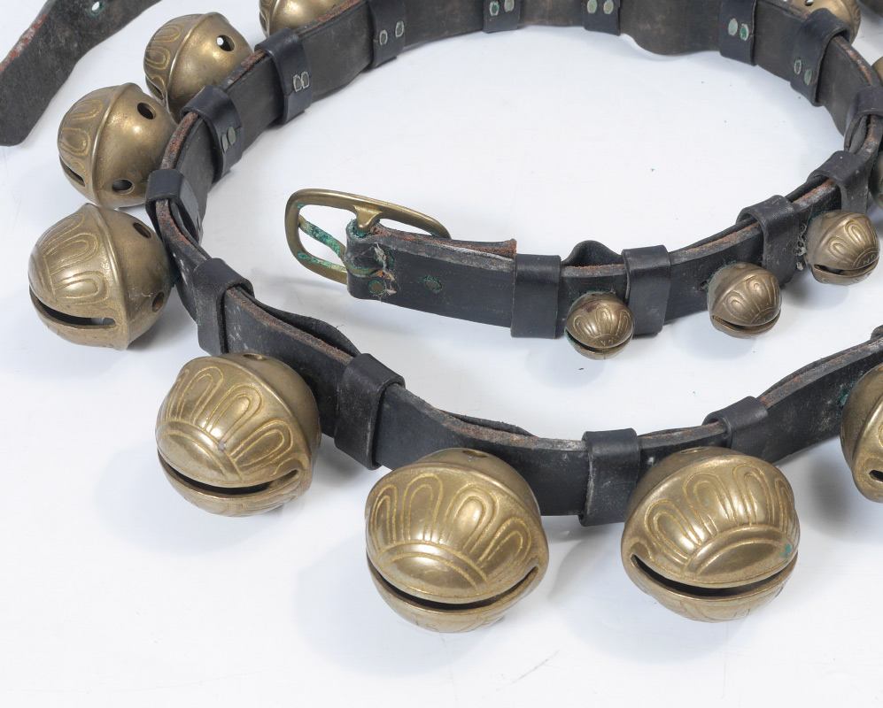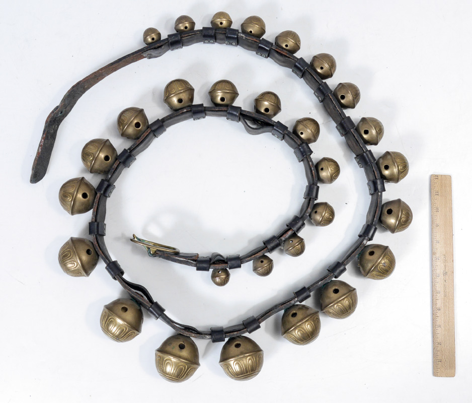 ANTIQUE SLEIGH BELLS: 7 feet of leather strap and buckle with 29 brass bells, graduating in size.
