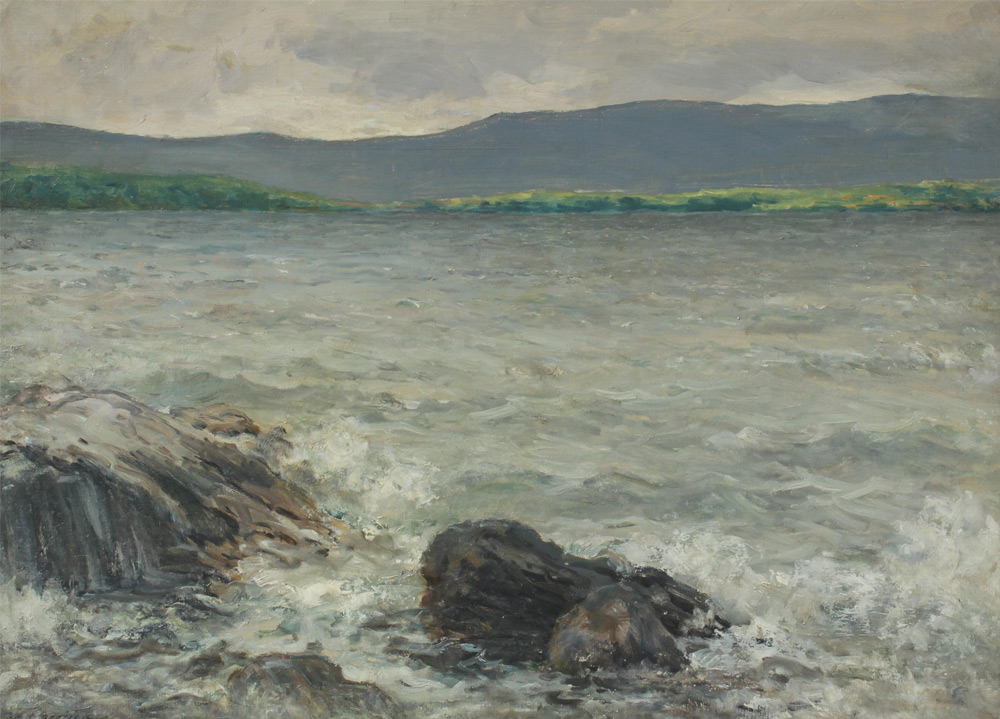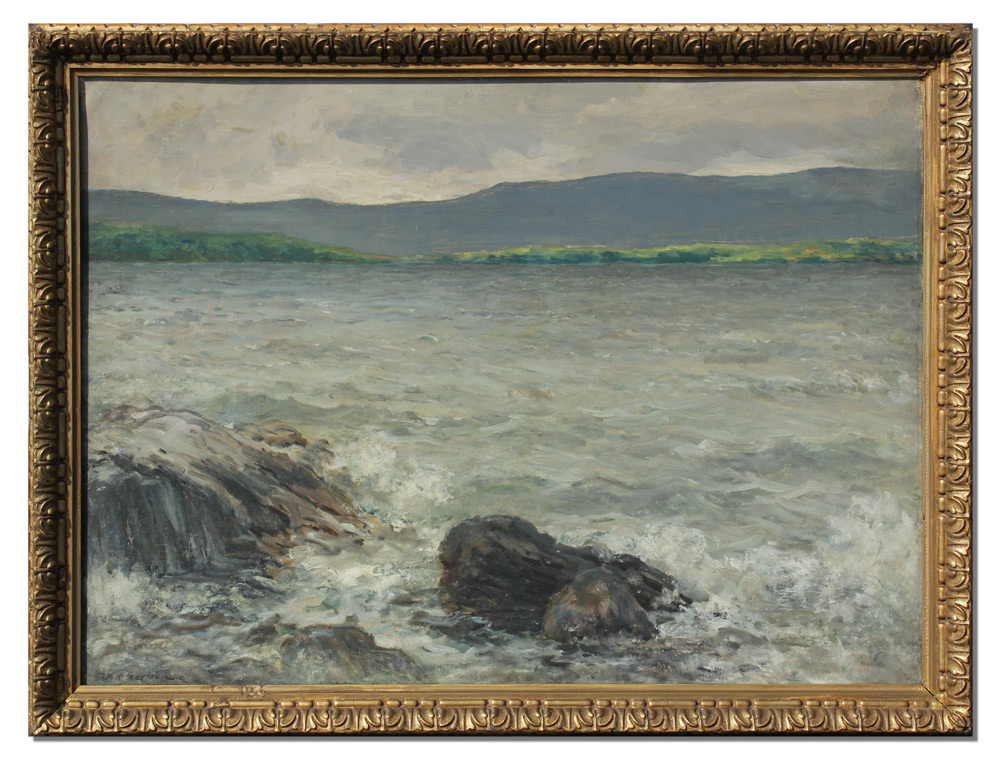 DERRICK, William Rowell, (American, 1857-1941): Lake Shoreline with Mountains in the Distance, Oil/Canvas, 26 1/2'' x 36'', signed lower left, illegibly titled in pencil on the back, framed, 30 1/4'' x 40 1/4''.