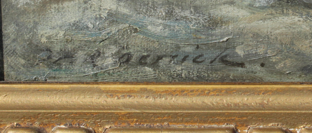 CONDITION: Needs cleaning, frame has been partially restored and overpainted, sold as is.