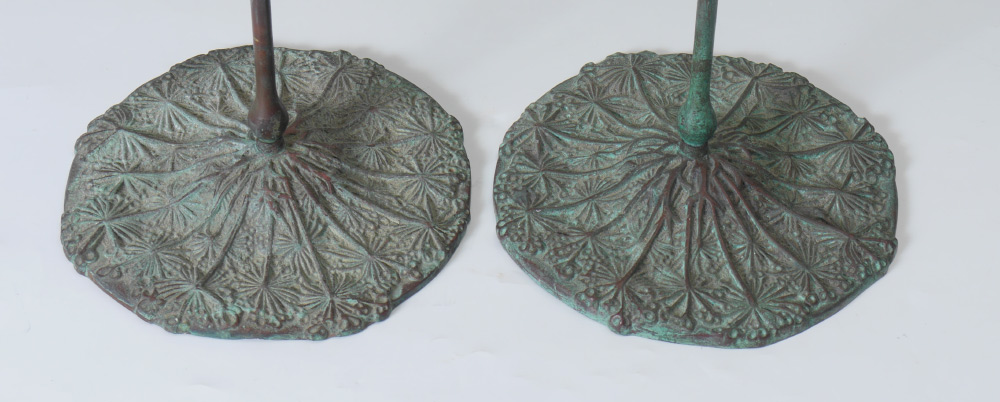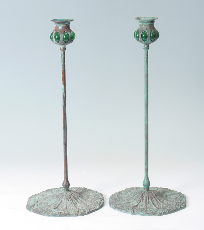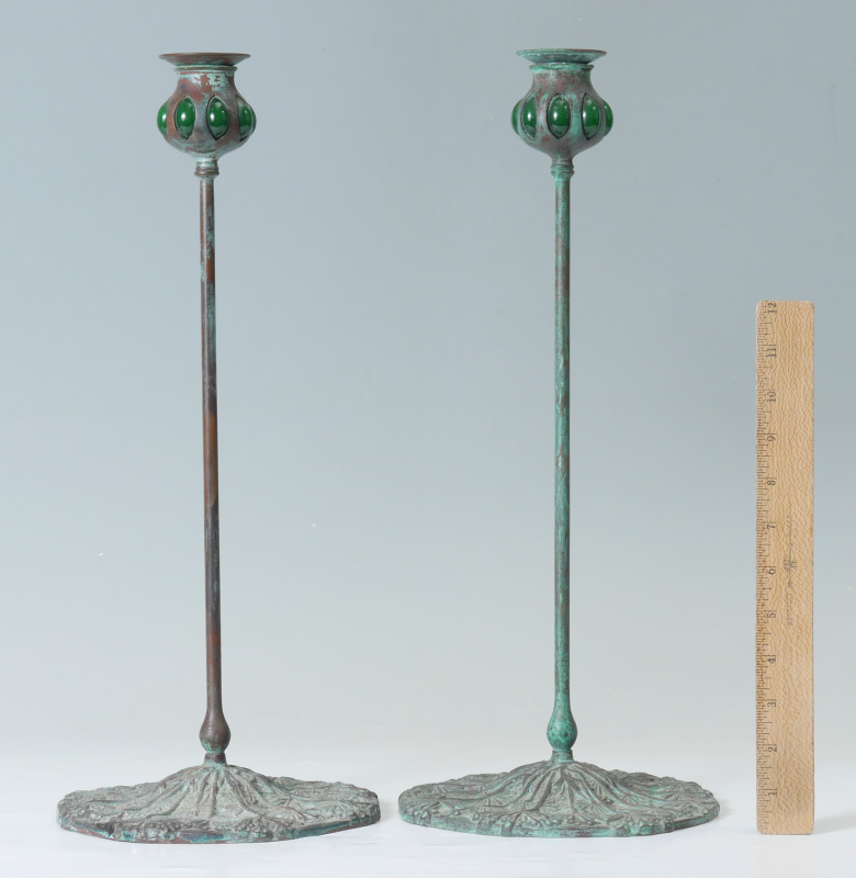 PAIR TIFFANY STYLE BRONZE CANDLESTICKS: 20th century patinated bronze candlestick with floriform top, green glass cabochon inserts. Thin body over cast base with floral motifs. Overall measures 17 3/4'' h. x 7 1/2''.