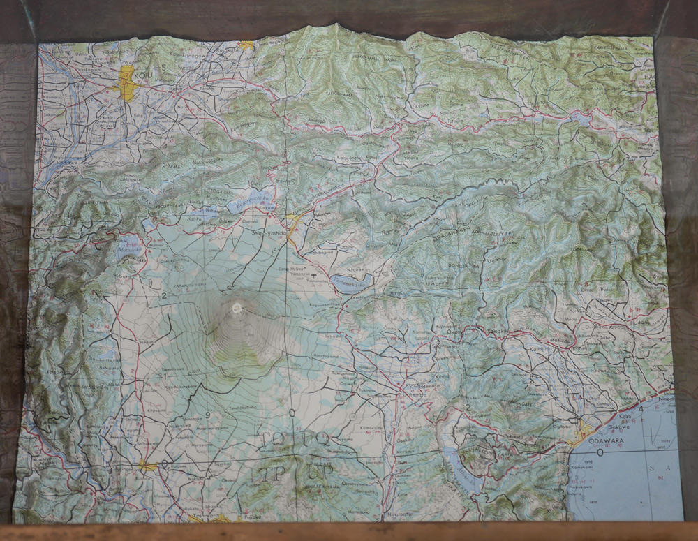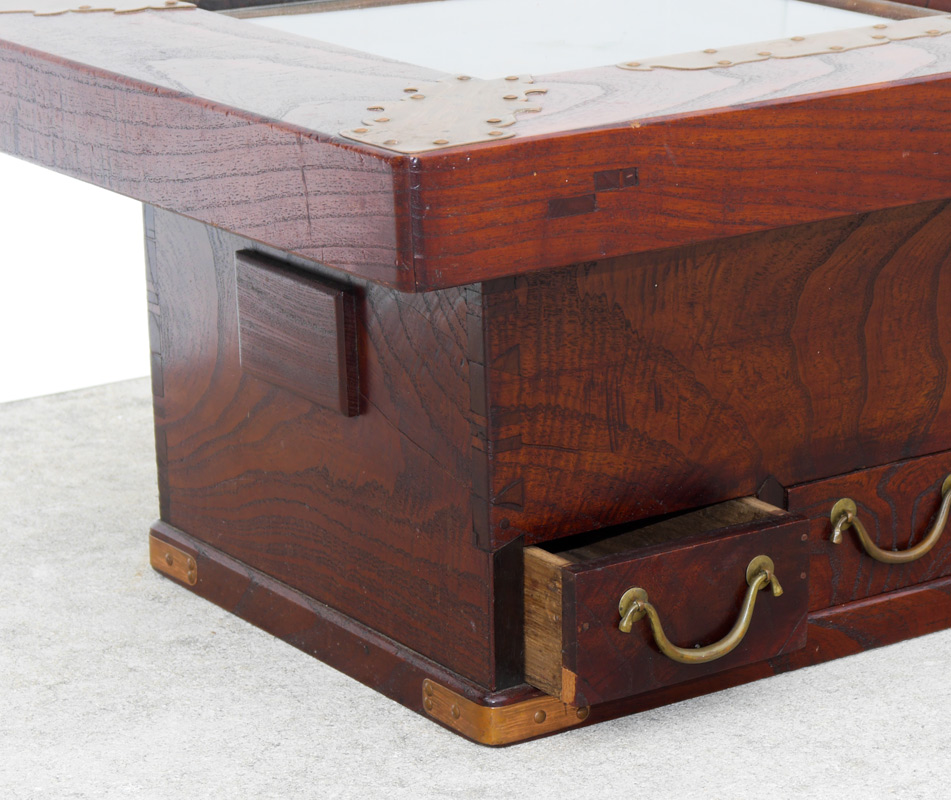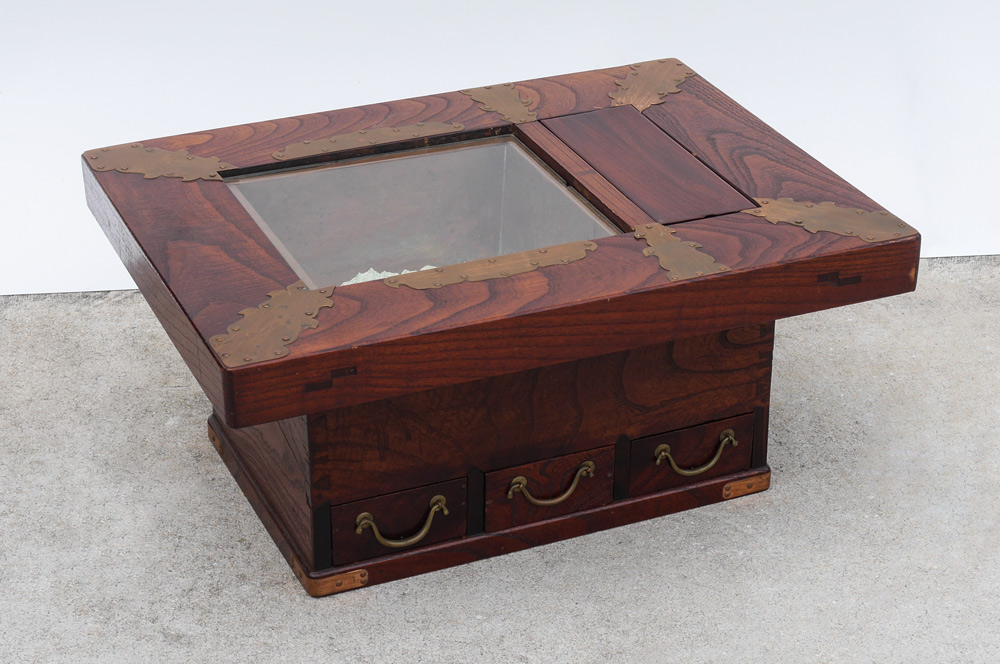 ORIENTAL COPPER LINED HIBACHI: Top with patinated copper decoration, copper lined inserts. One side with glass top over inset topographical map of the Mt. Fuji region. Overall measures 13 1/4'' x 29 3/4'' x 21 3/4''.