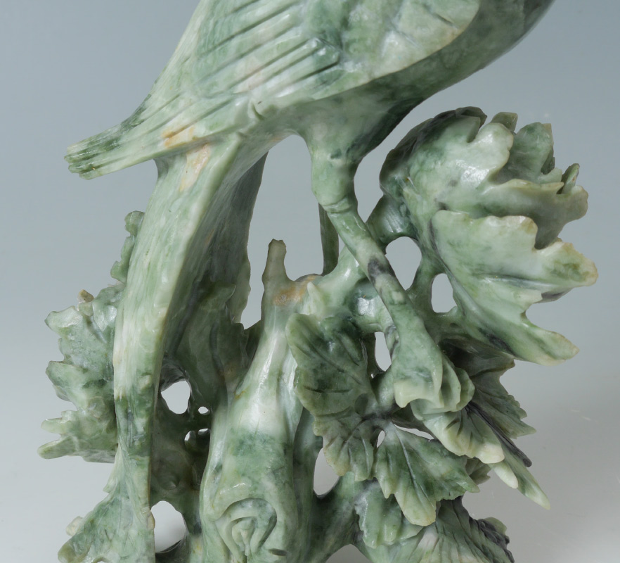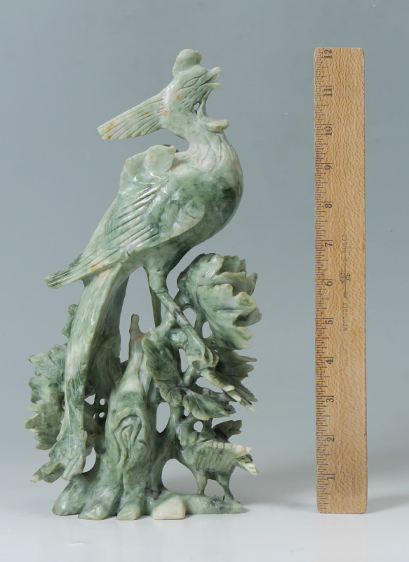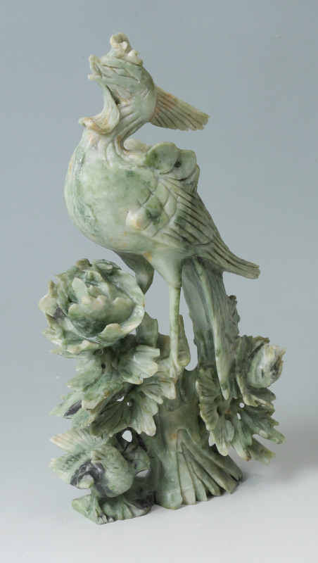CHINESE CARVED FIGURAL SOAPSTONE BIRD: Figural bird of paradise atop floral stems with small bird below. Measures 12 1/4'' x 6'' x 2 3/4''.