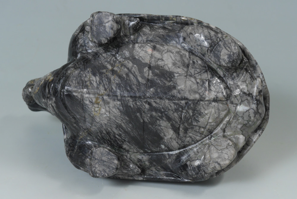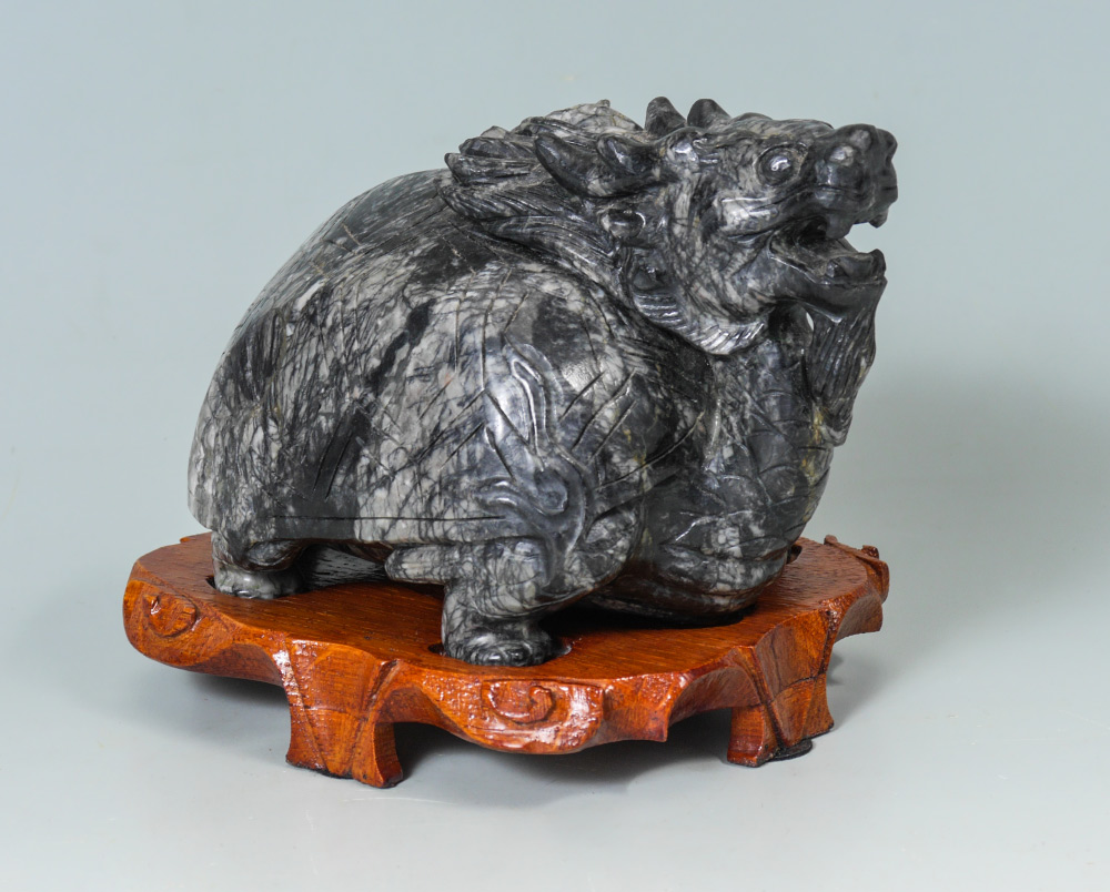 CHINESE CARVED SOAPSTONE DRAGON TURTLE: Grey soapstone figure of mythological dragon turtle, 4 1/2'' h. x 7 1/4'' x 5''. Sold with fitted carved wood stand, 1 1/4'' h. x 7'' x 5 1/2''.