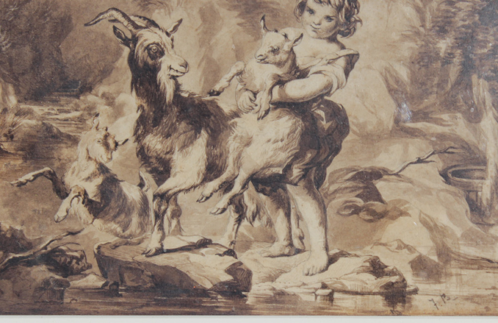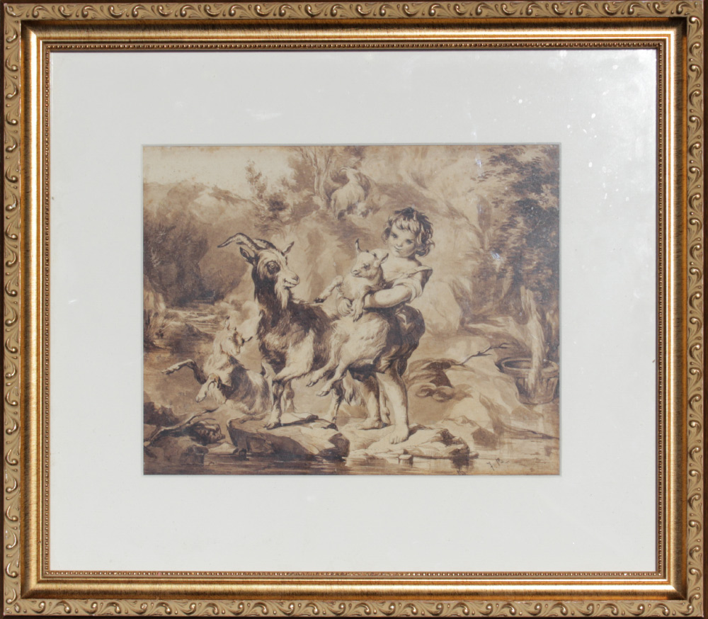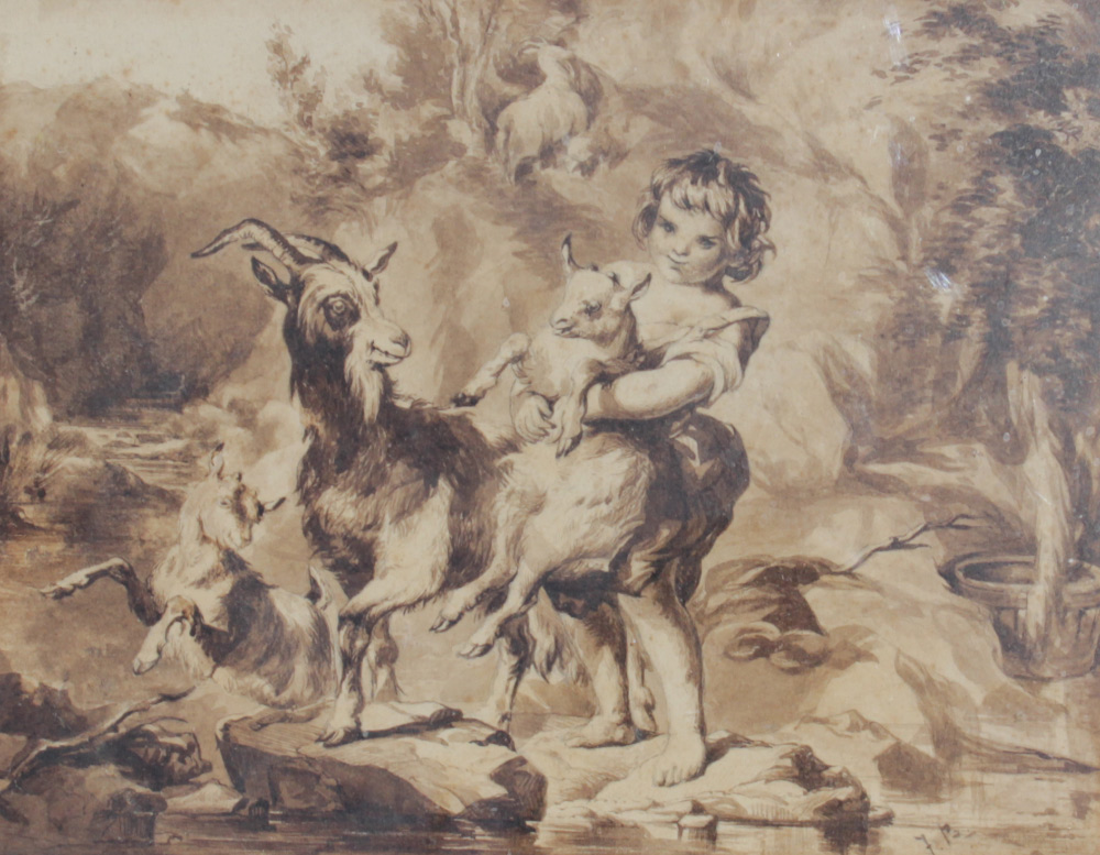 OLD MASTER STYLE ANTIQUE PAINTING OF CHILD WITH GOATS: Watercolor, 8'' x 10 1/4'' faintly monogrammed lower right ''FB''?, framed, 15'' x 17 1/4''.