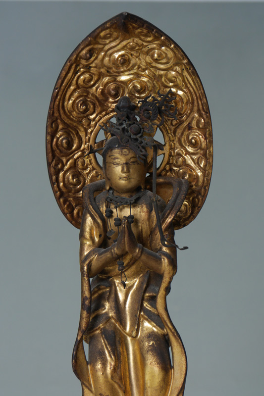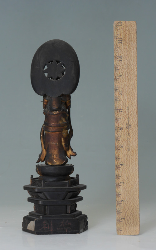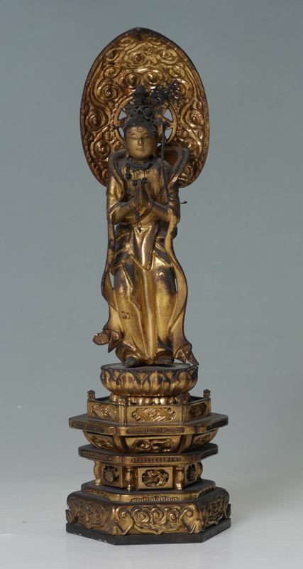CARVED WOOD QUAN YIN FIGURE: Carved and gilt wood figure on a lacquered pedestal. Metal headdress and necklace. Height 11'', diameter 3.5''. Actual age unknown.