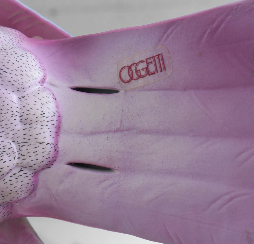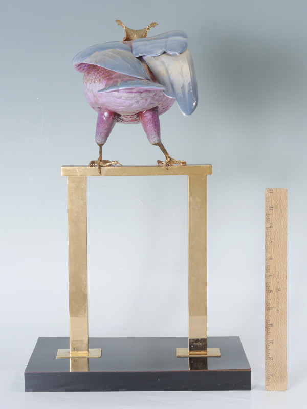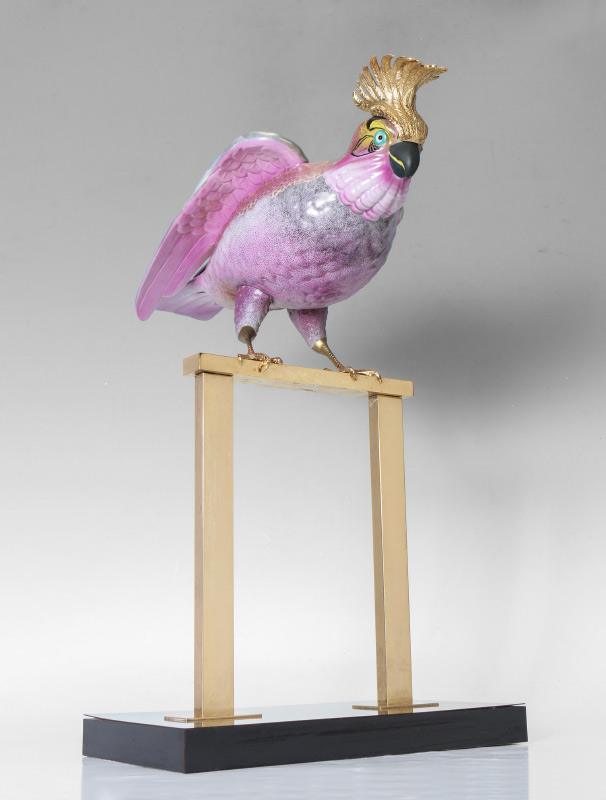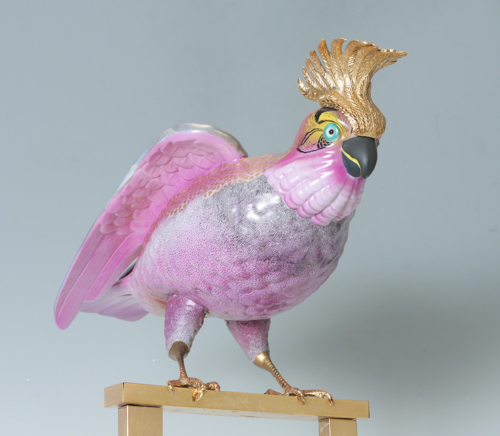 OGGETTI MANGANI PORCELAIN COCKATOO: Polychrome decorated porcelain figure of a cockatoo with shades of pink and gilt decoration. Brass crest, feet and perched on brass stand, laminate wood stand. Oggetti clear sticker on tail. Overall measures 22 1/4'' h. x 13 1/2'' x 7 1/4''.