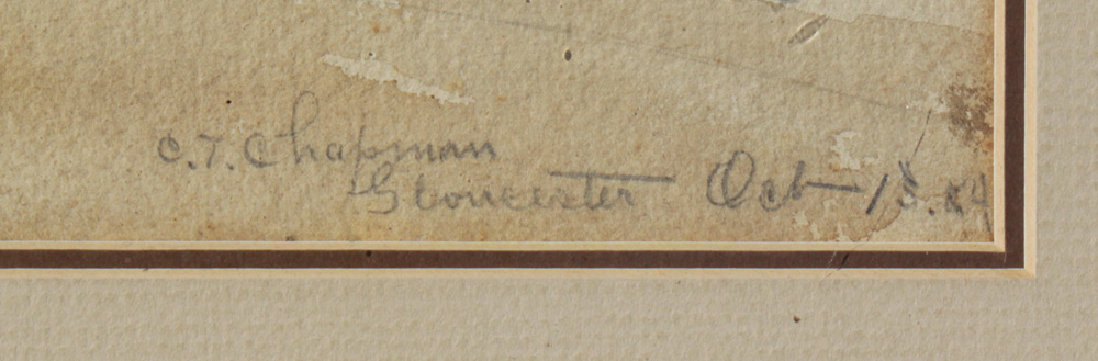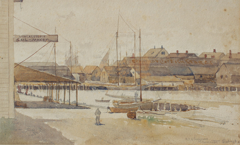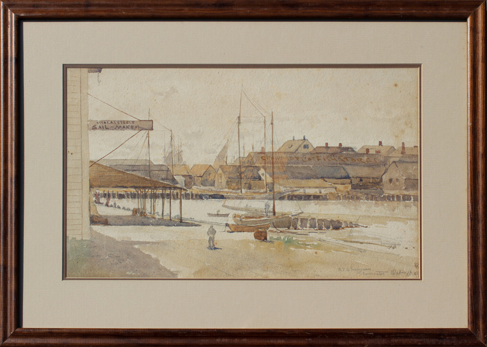 CHAPMAN, Carlton T., (American, 1860-1925): Gloucester Dockside Scene , Watercolor, sight size 10 1/2'' x 18 1/2'', signed lower right, titled and dated 1884, framed, 17 1/2'' x 24 1/2''.