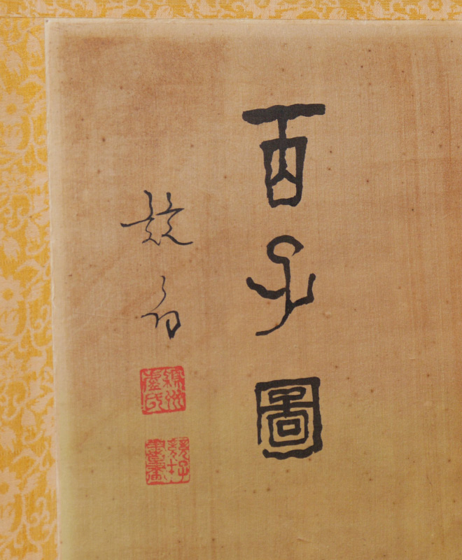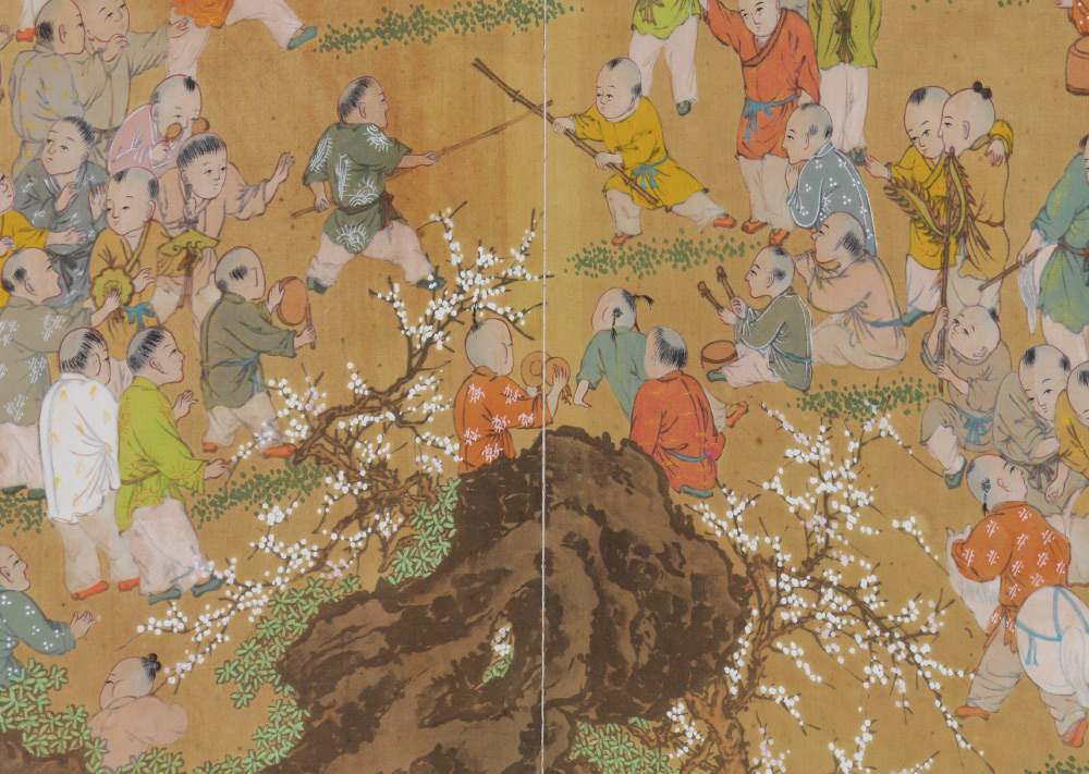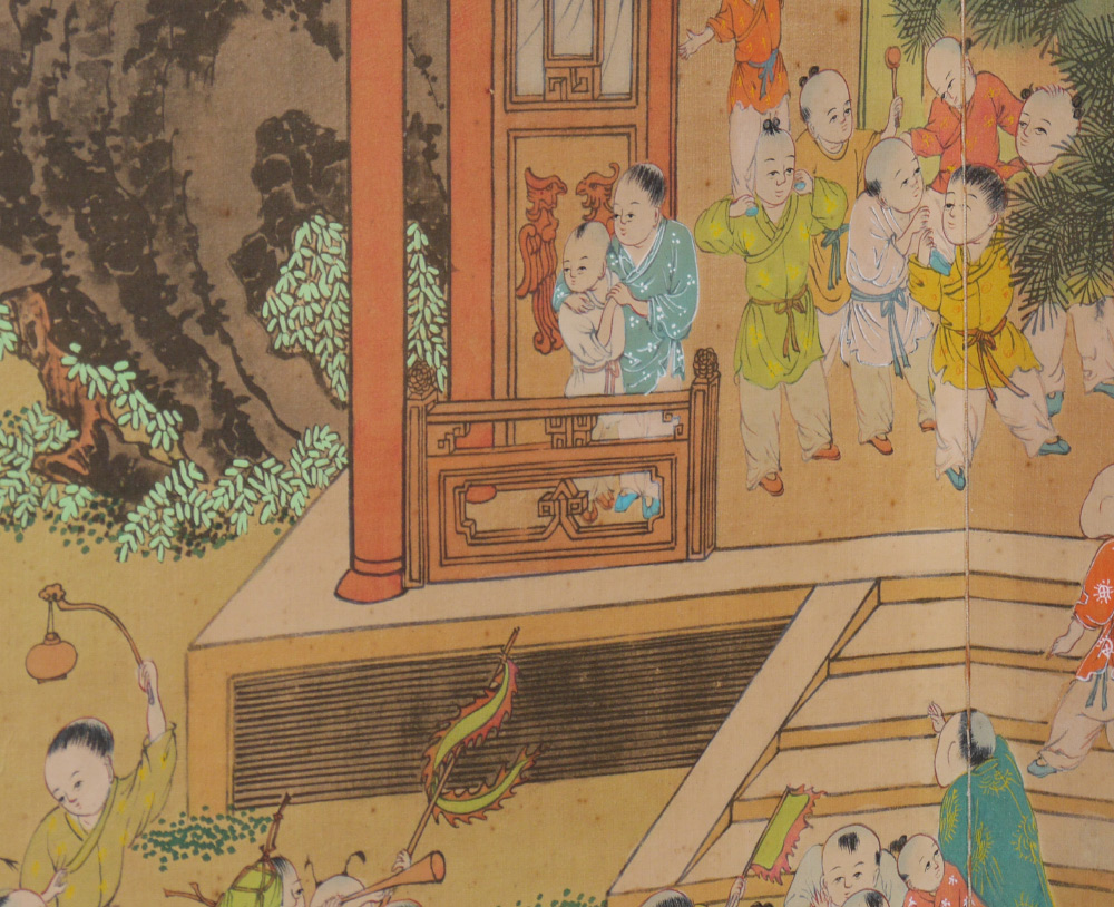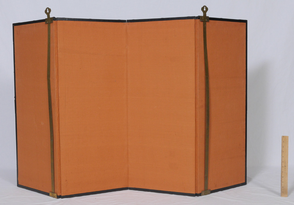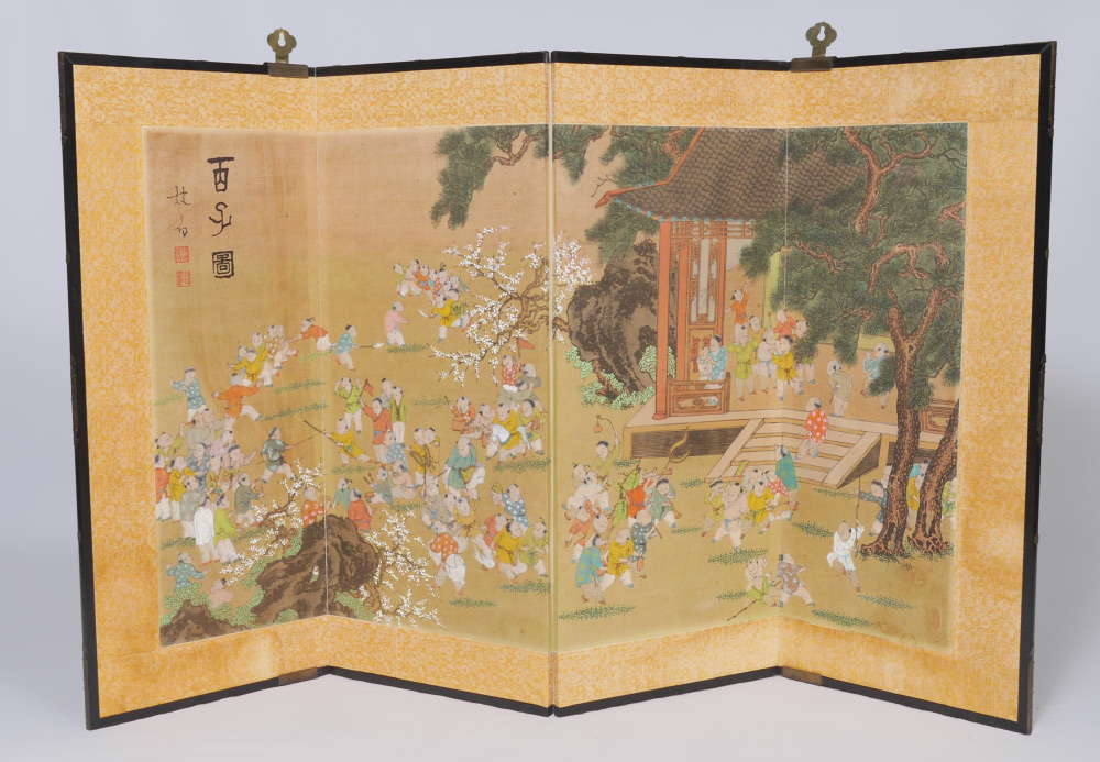 JAPANESE FOLDING WALL SCREEN: 4 folding panels, hand painted outdoor genre scene of school children playing. Cloth border, brass trim, each panel 35'' h. x 14 3/4''.