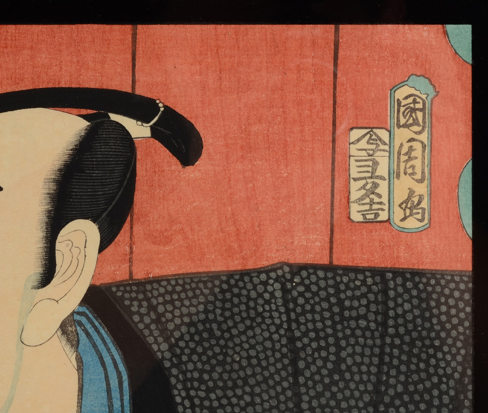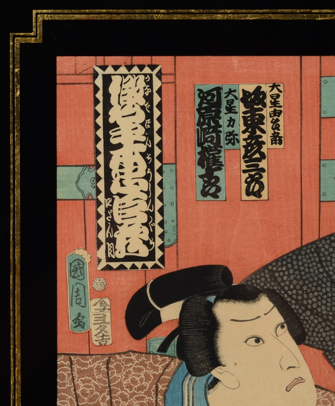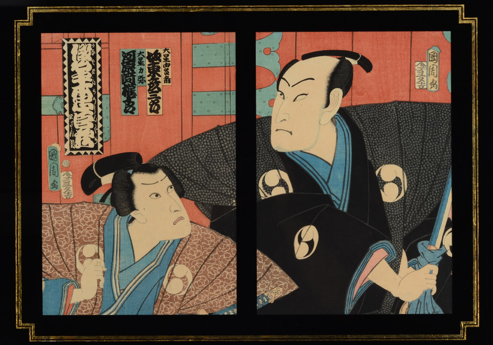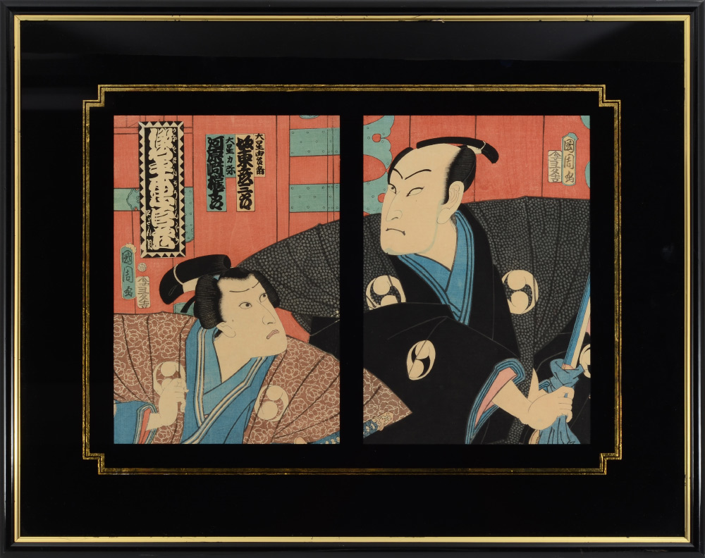 JAPANESE KABUKI WOODBLOCK DIPTYCH: Diptych of Two Kabuki Actors, Print, sight size 13 1/4'' x 9 1/2'', custom reverse painted glass mat, black lacquer frame, 23'' x 29''.