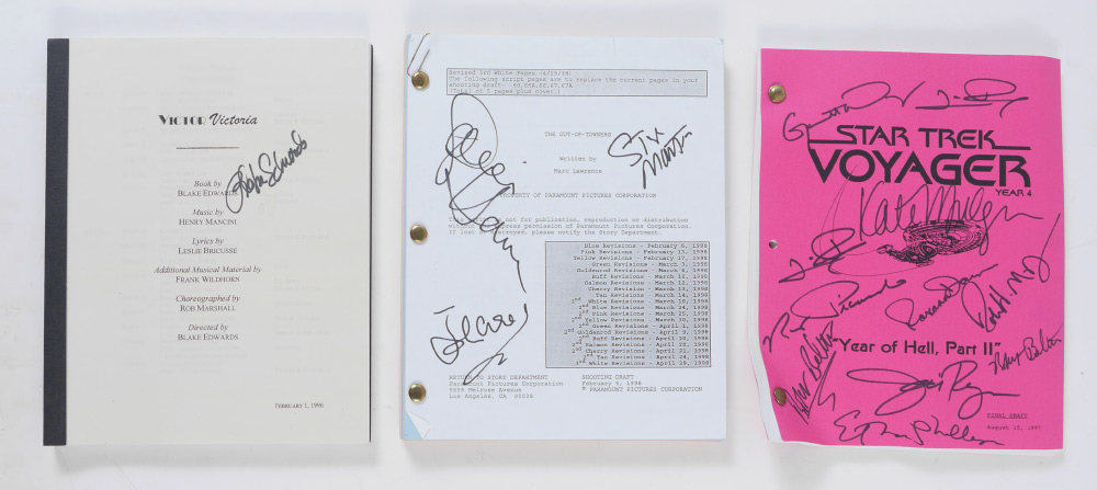 3 TELEVISION & MOVIE SIGNED SCRIPTS: 3 scripts total to include 1) Star Trek Voyager, Year 4, ''Year of Hell, Part II'', final draft, August 15th 1997, 10 cast signatures (1 person signed twice) to include Kate Mulgrew, Robert Picardo, Robert Beltran, Garrett Wang and more. 11'' x 8 1/2''. 2) ''The Out-Of-Towners'', shooting draft, February 5, 1998, signed by Steve Martin, Goldie Hawn and John Cleese. 11'' x 8 1/2''. 3) ''Victor Victoria'', February 1, 1996, signed by Blake Edwards. 11'' x 8 1/2''.