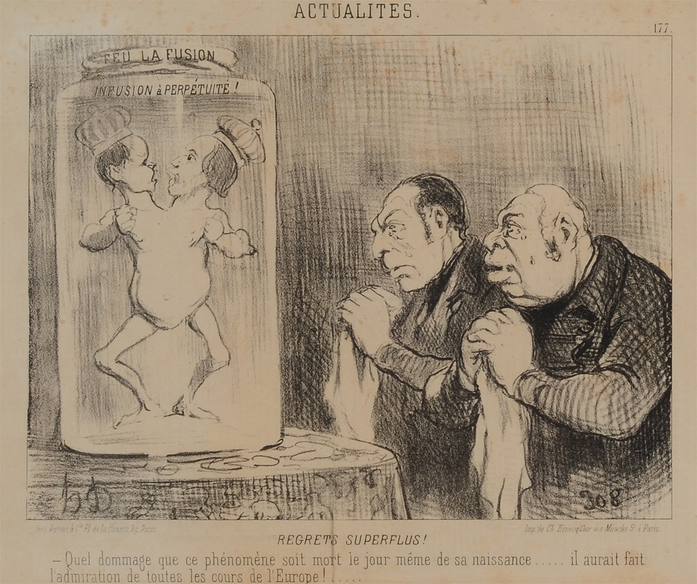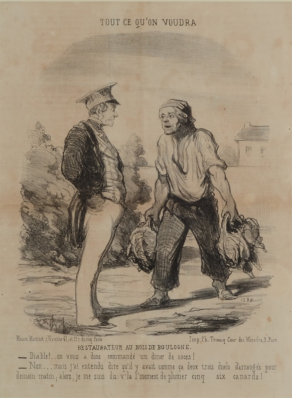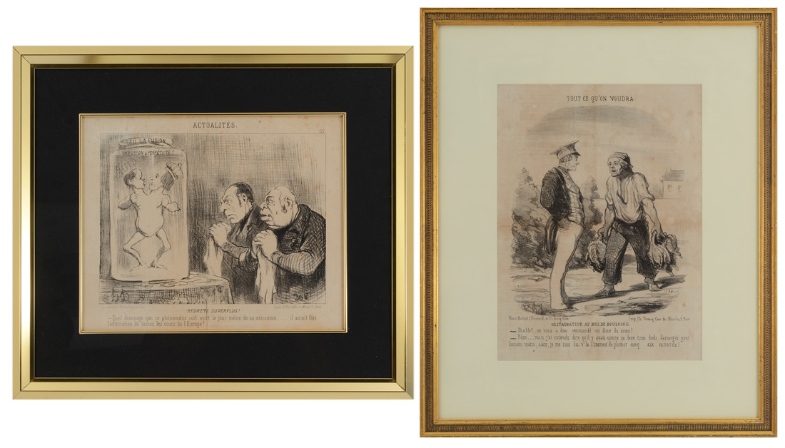 DAUMIER, Honore, (French, 1808-1879): 2 piece Lithograph lot to include 1) ''Tout ce ou'on voudre'', 12 1/2'' x 9 1/4'', framed, 19 1/2'' x 16'', 2) From Actualites ''Regrets Superflus'', sight size 9 1/2'' x 11 3/4'', contemporary metal frame, 16 1/4'' x 18 1/4''.
