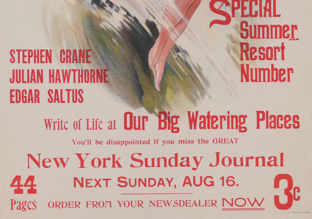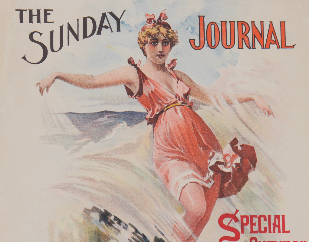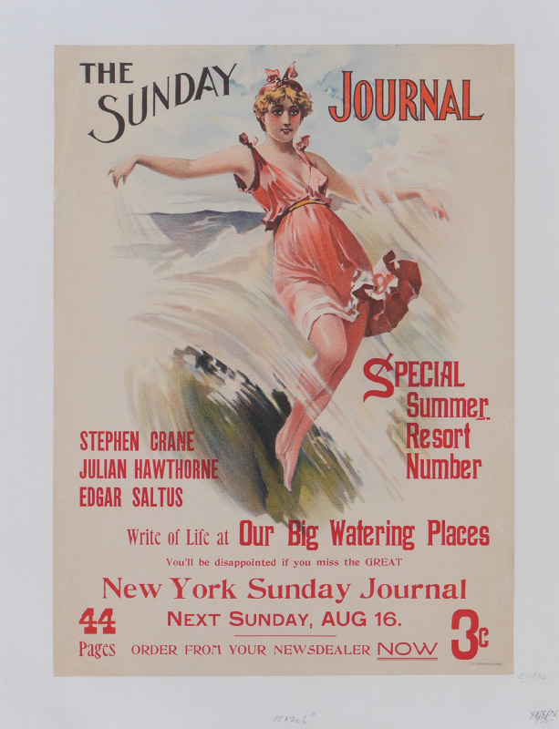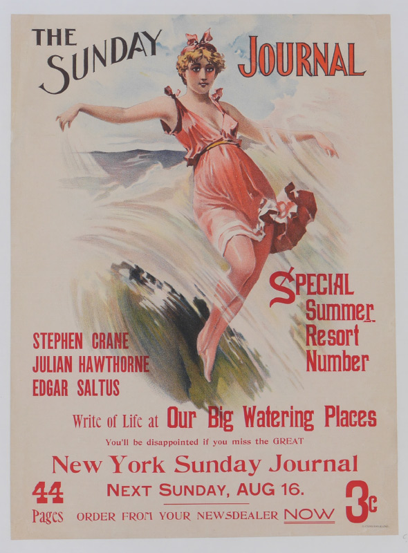1896 NEW YORK SUNDAY JOURNAL POSTER: Featuring a bathing beauty in waves, for August 16th, 1896, Lithograph, published H. A. Thomas & Wylie, 20 1/2'' x 15'', backed with linen 24 1/4'' x 18 3/4''.