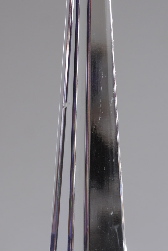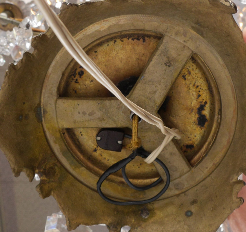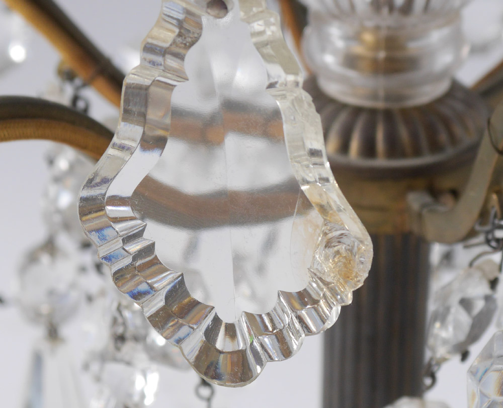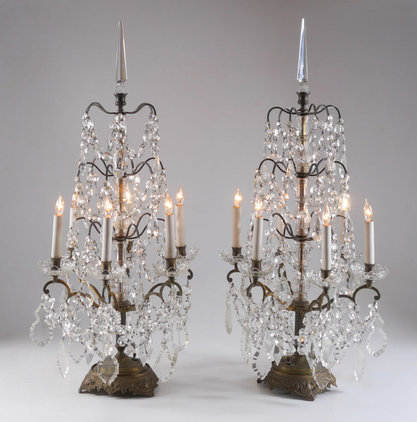 PAIR BACCARAT QUALITY TABLE CHANDELIERS: Crystal spire finials over 4 levels of garland and drop prisms, the lowest level have 6 electrified lights. Gilt cast metal base, overall 35'' x 16 1/2''.