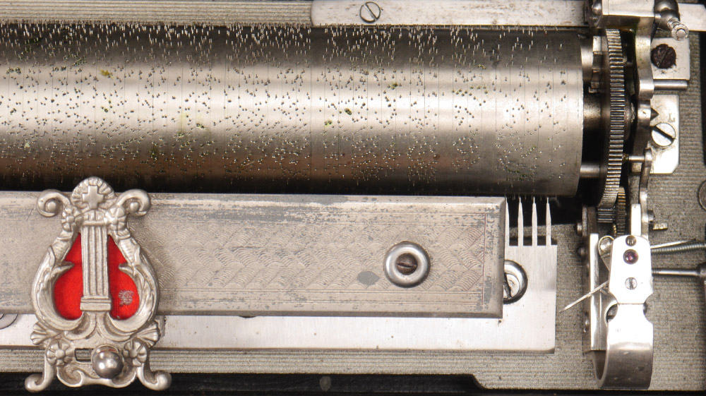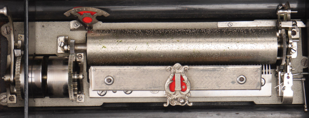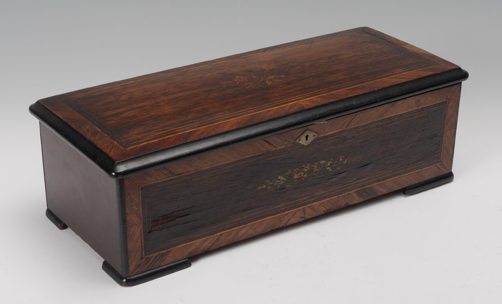 PAILLARD SWISS INLAID CYLINDER ROLL MUSIC BOX: Banded, string and marquetry floral inlay on hinged lid and front. 10 song roll, single comb movement with all teeth present, original Paillard, New York plaque inside top. Overall measures 6 1/2'' h. x 22'' h. x 9 1/2''.