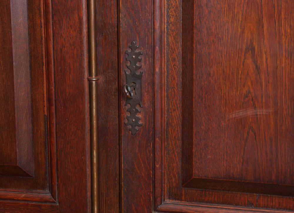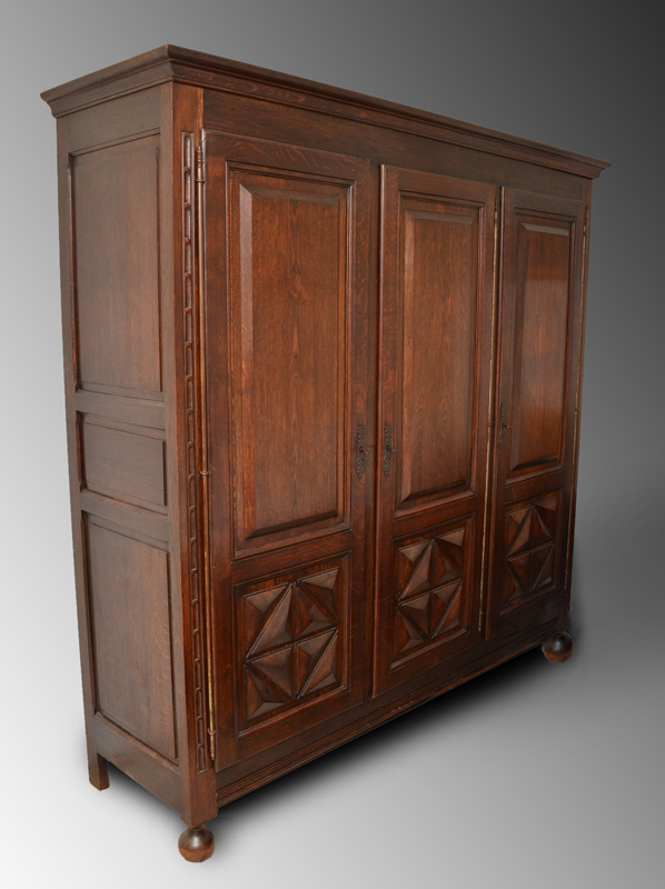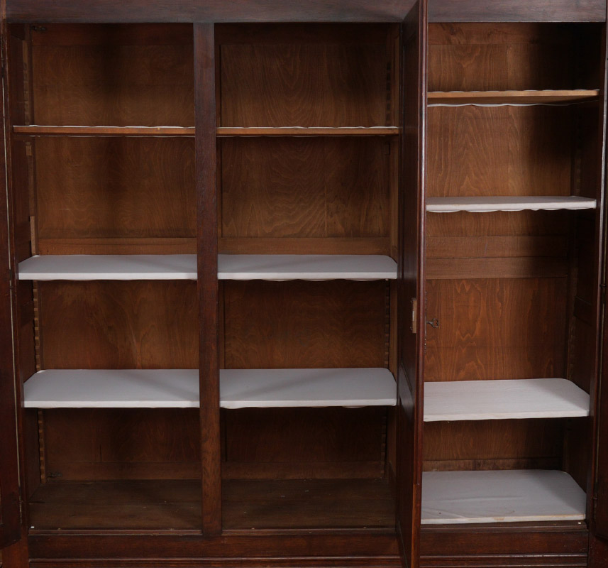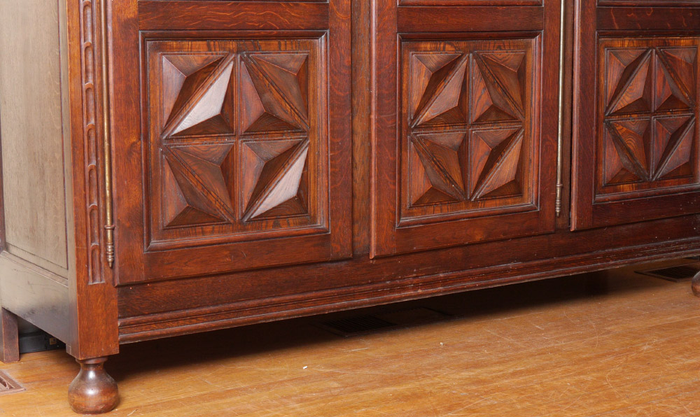 3 DOOR TIGER OAK LINEN CHEST: Turn of the century, 3 blind door chest with carved decoration lower half of each door. Each section with 3 adjustable shelves, overall measures 81'' h. x 82 1/4'' x 23 3/4''.