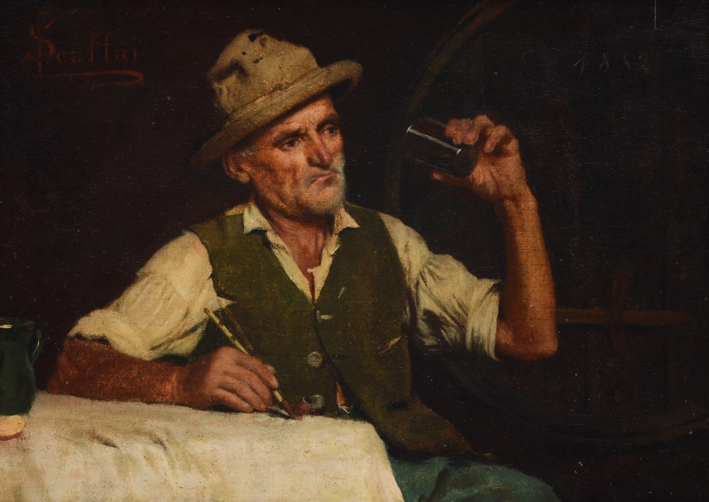 SCAFFAI, Luigi (Italian, 1837-1899): Elderly Man Drinking Wine and Smoking His Pipe, Oil/Canvas, 9'' x 12 1/2'', signed upper left, gilded and carved frame, 17'' x 20 1/2''.