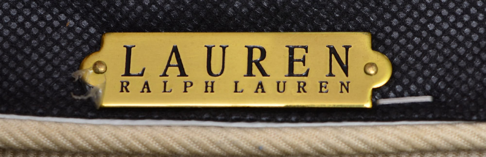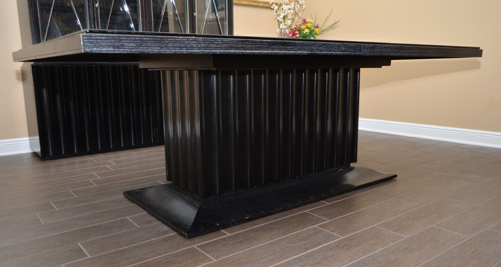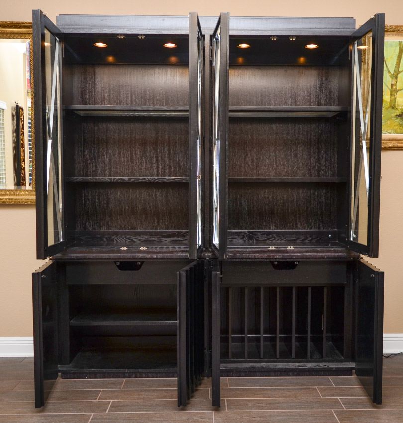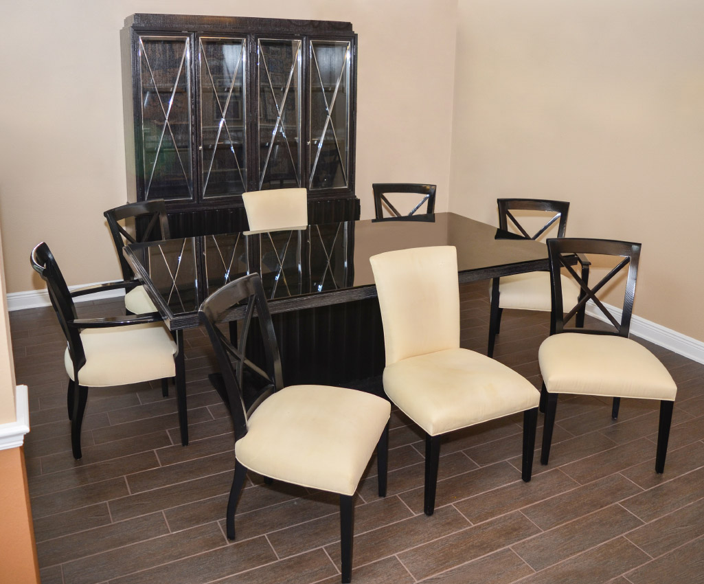 RALPH LAUREN DESIGNER BLACK DINING SET: 10 pieces total, designed and retailed by Ralph Lauren to include 1) Table with single shaped pedestal base, 31'' h. x 88'' x 48'', glass top 86 3/4'' x 46 3/4''. 20'' leaf. 2) China cabinet with illuminated interior, glass shelves, 4 glass shelves with chrome trim. 4 shaped blind lower doors, left side with single door over shelf, right side with single drawer over removable partitions. 82'' h. x 71 1/2'' x 19 1/2''. 3-8) 6 wood frame chairs with cream upholstered seats, the 2 arm chairs 36'' h. x 24'' x 25''. 9-10) 2 fully cream upholstered side chairs, 36'' x 22 1/2'' x 25 1/2''.