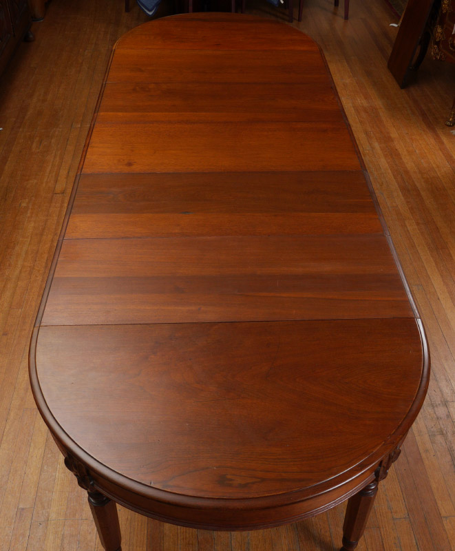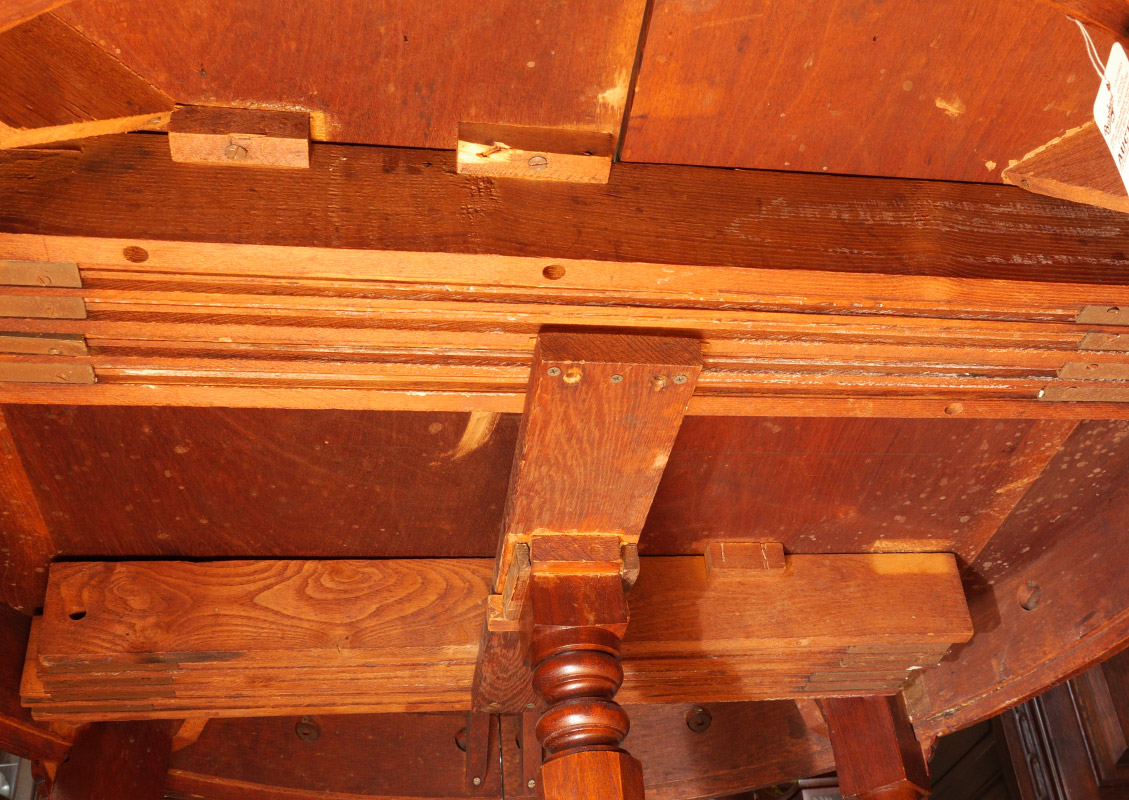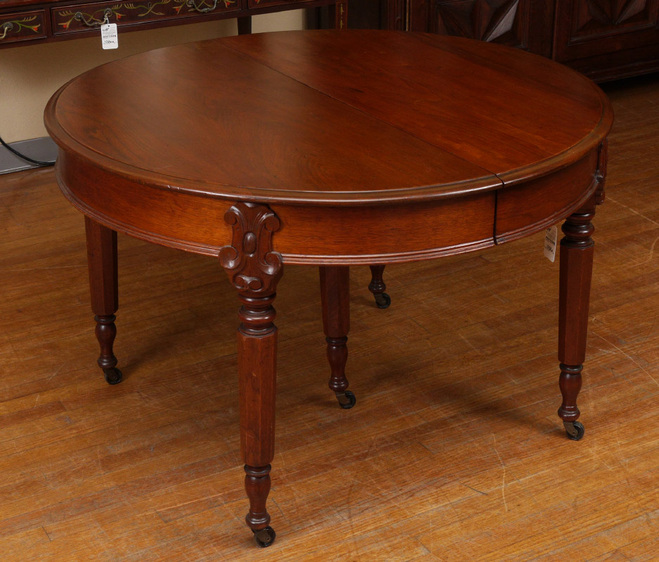 VICTORIAN DINING TABLE AND 6 LEAVES: Round dining table with applied decoration at leg joints, carved and turned legs ending in castors, 30 1/2'' h. x 46 1/2''. The 6 leaves measures 16'' each.