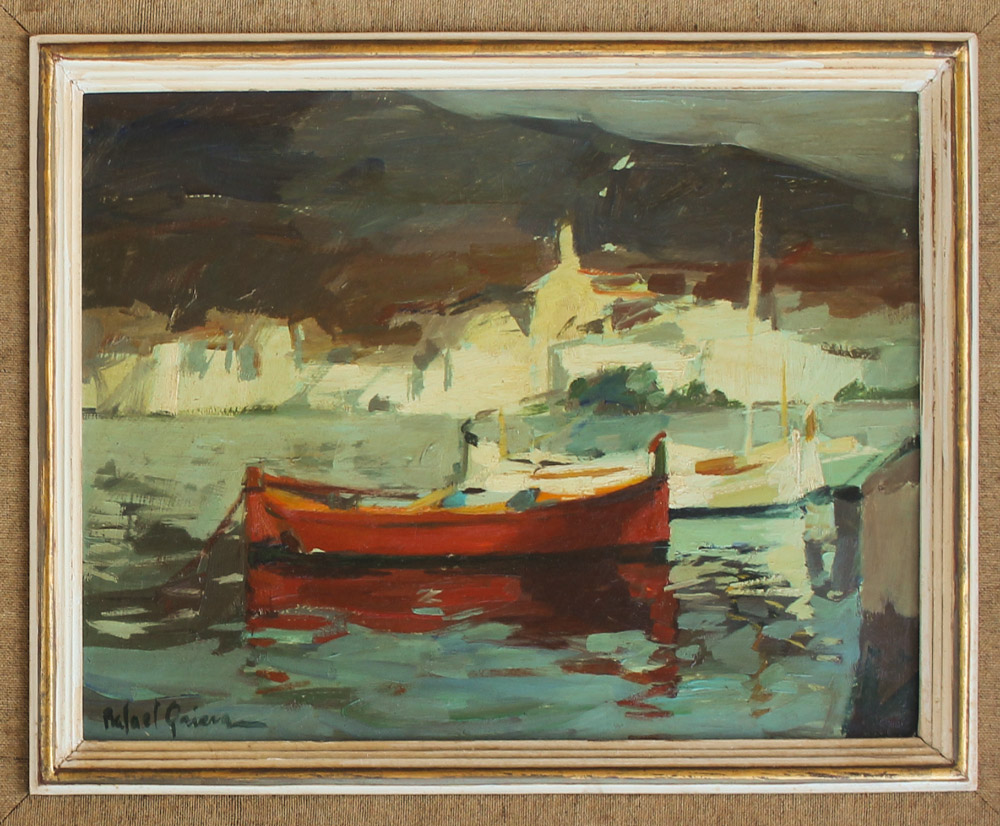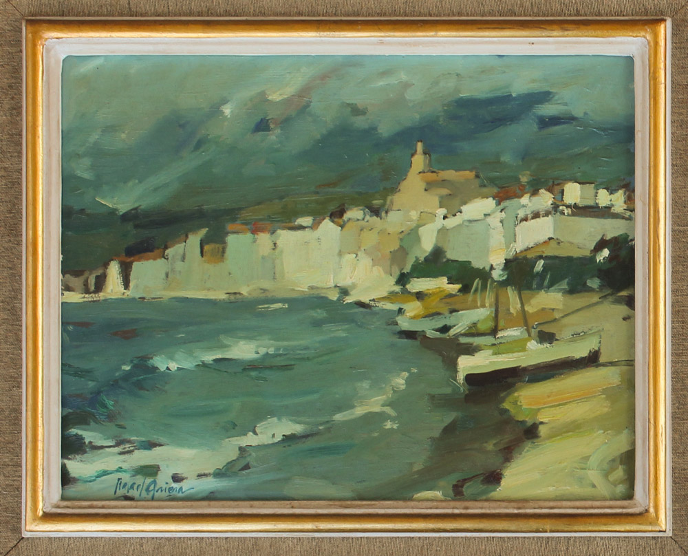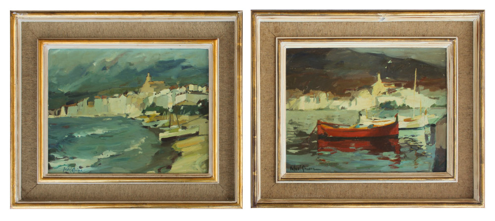 GRIERA, Rafael (Spanish, 1934- ): 2 Oil/Masonite, (1) Depicts A Harbor Scene with Moored Boats, 10 3/4'' x 13'', signed lower left, framed, 16'' x 19''. (2) Depicts Coastal Village With Beached Boats, 11'' x 13 3/4'', signed lower left, framed, 16 1/4'' x 19 1/2''.