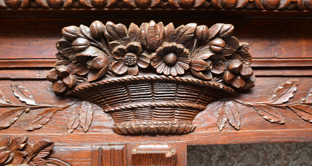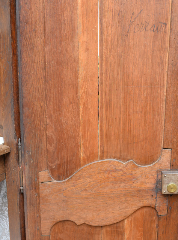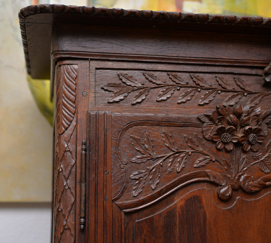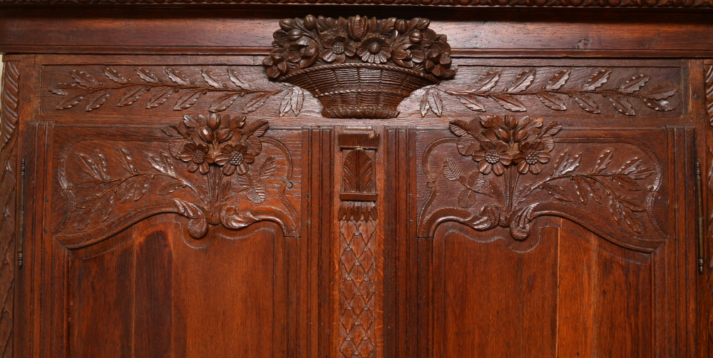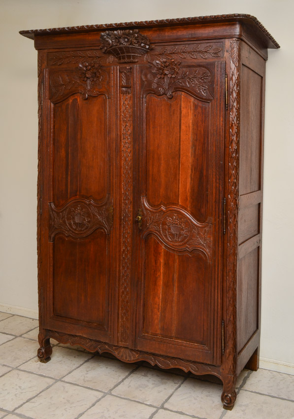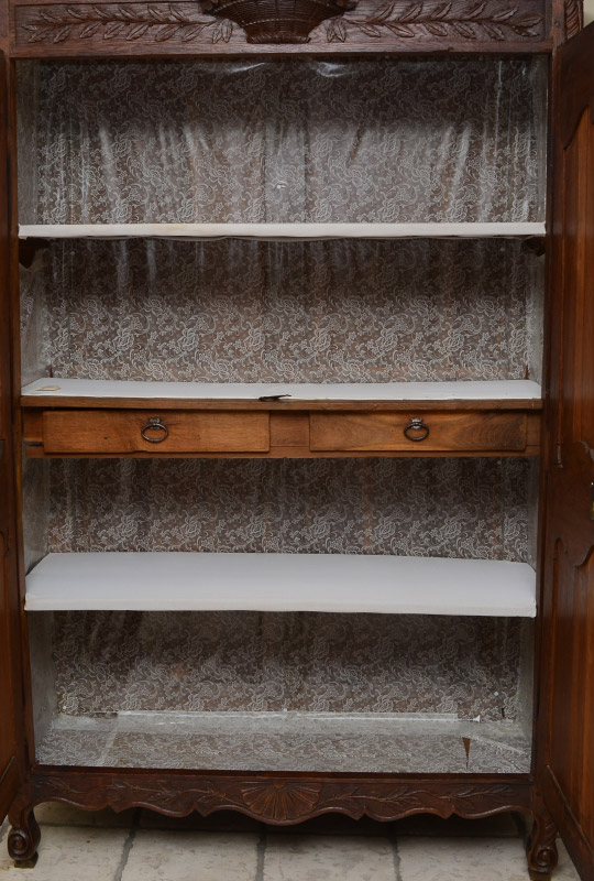 EARLY FRENCH TALL 2 DOOR CUPBOARD: Top with carved trim over carved pediment with basket of flowers and foliate motif. 2 blind doors with matching floral decoration at top and center, carved and shaped skirt with shell, shaped legs. Lined interior with 3 shelves and 2 drawers. Overall measures 81'' h. x 58'' x 22 1/2''.
