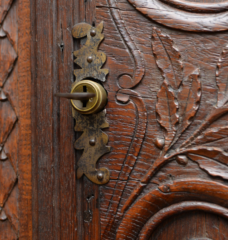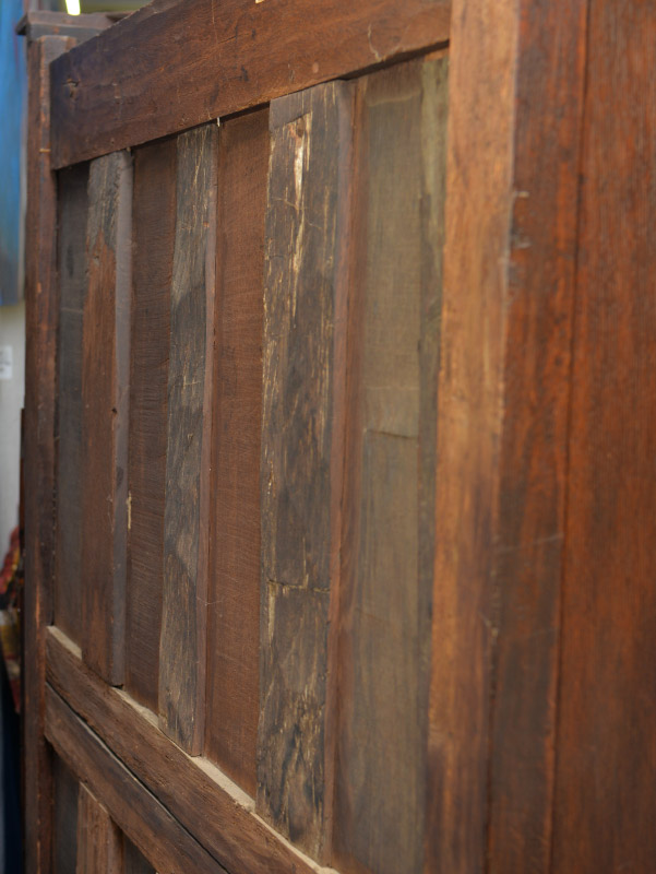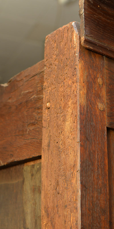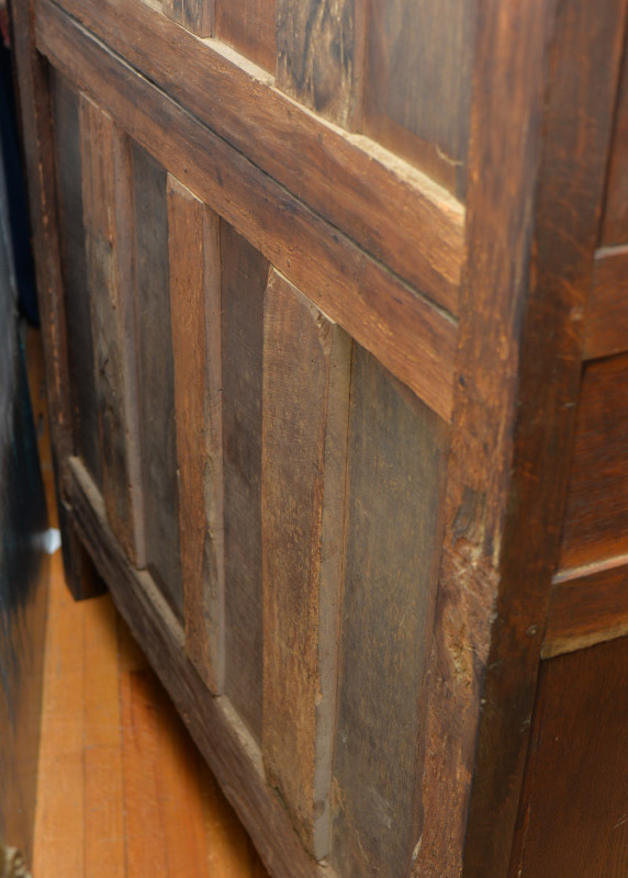 CONDITION: Chip to trim on top, split on pediment and one door, evidence of prior wood worm activity.