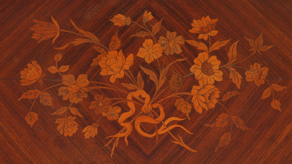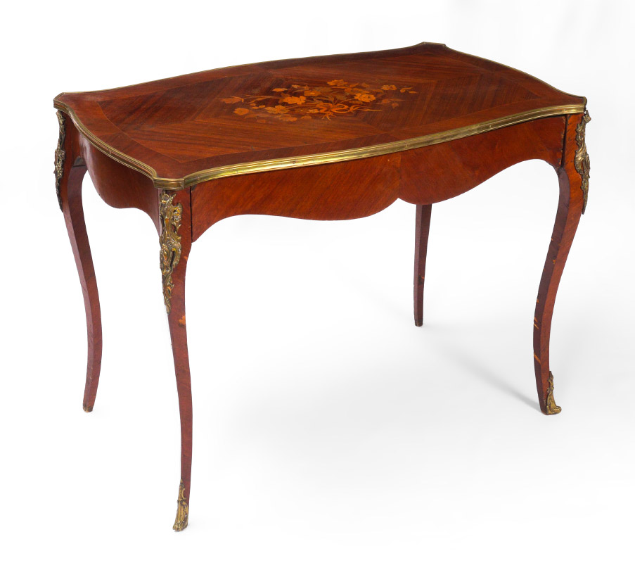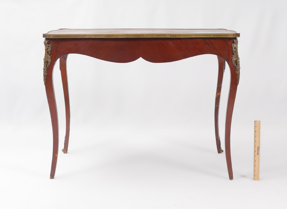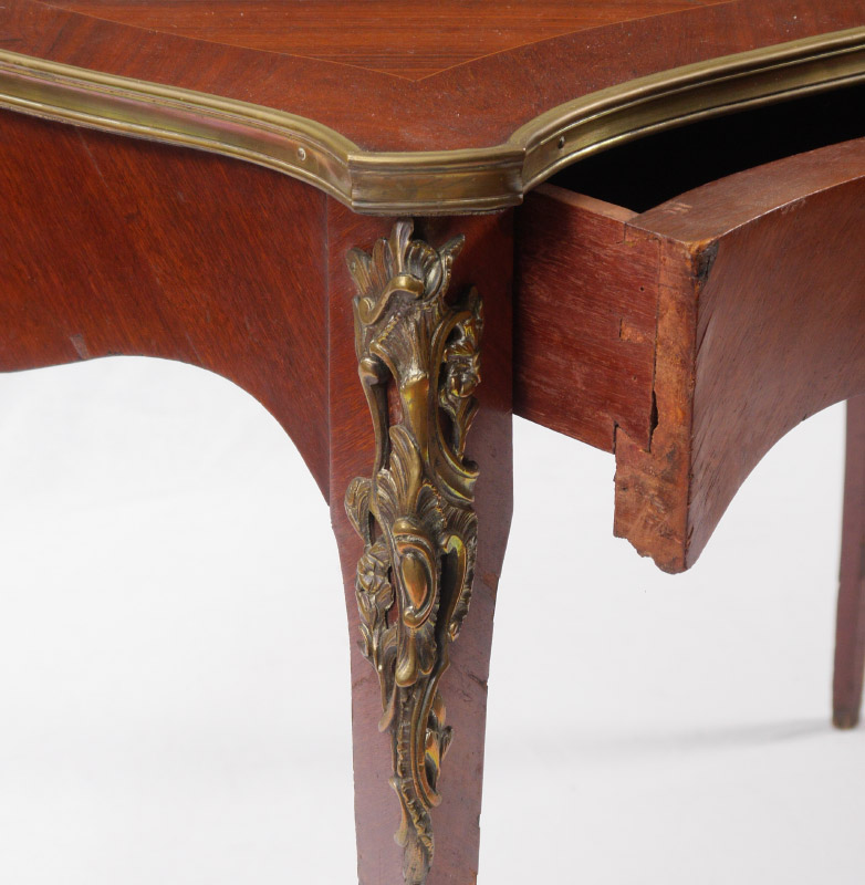 FRENCH ORMOLU MOUNTED WRITING TABLE: Bookmatch veneer with floral inlay top, brass trim, ormolu mounts at top of shaped legs and at feet. Shaped skirt with single drawer, 29 1/2'' h. x 38 3/4'' x 22 3/4''.