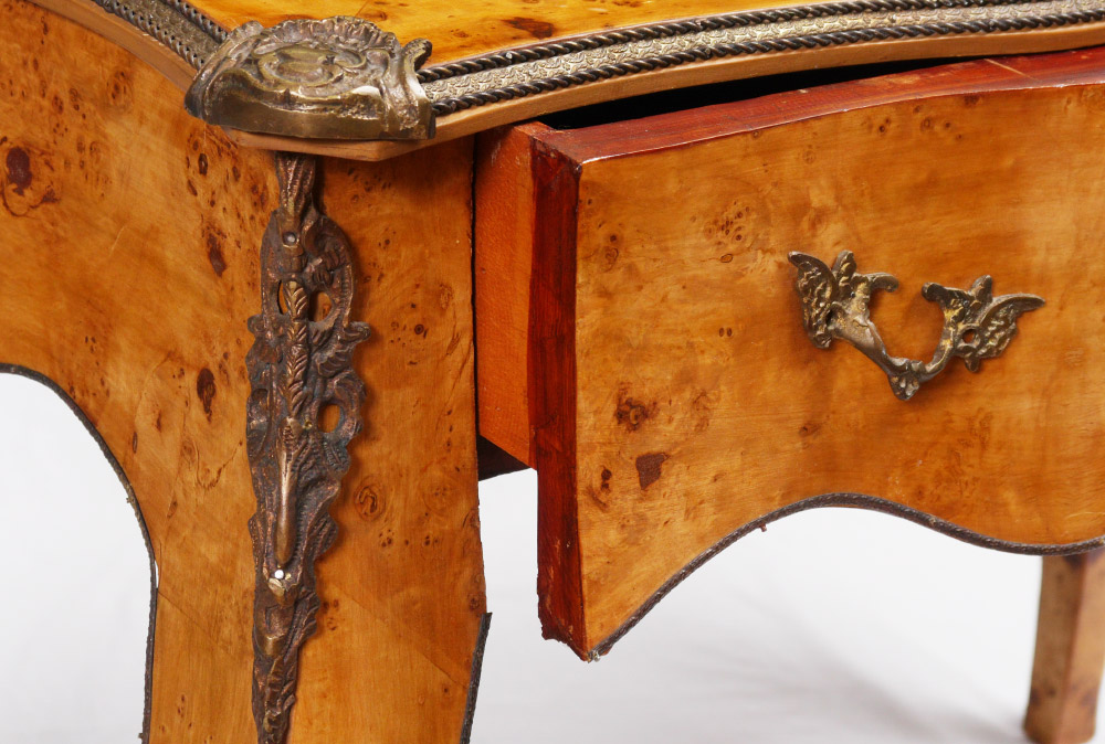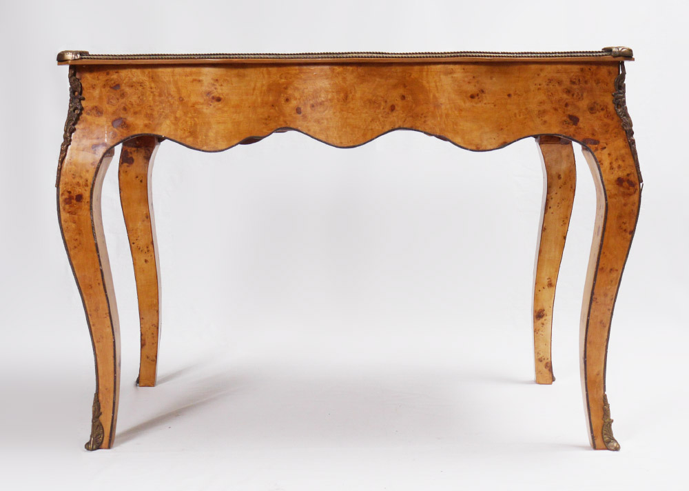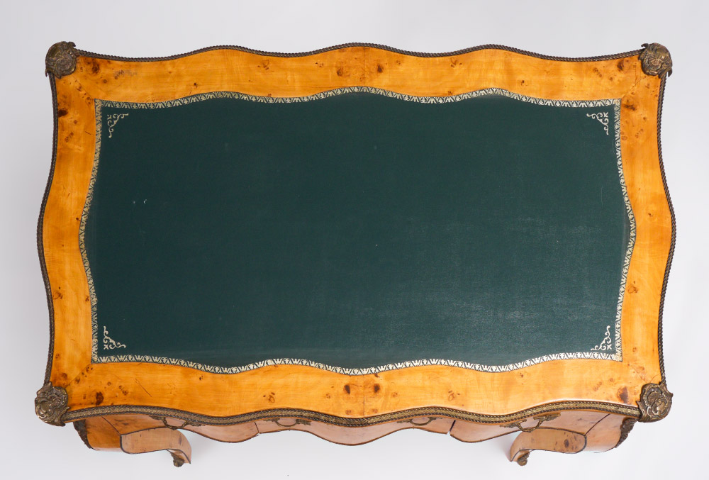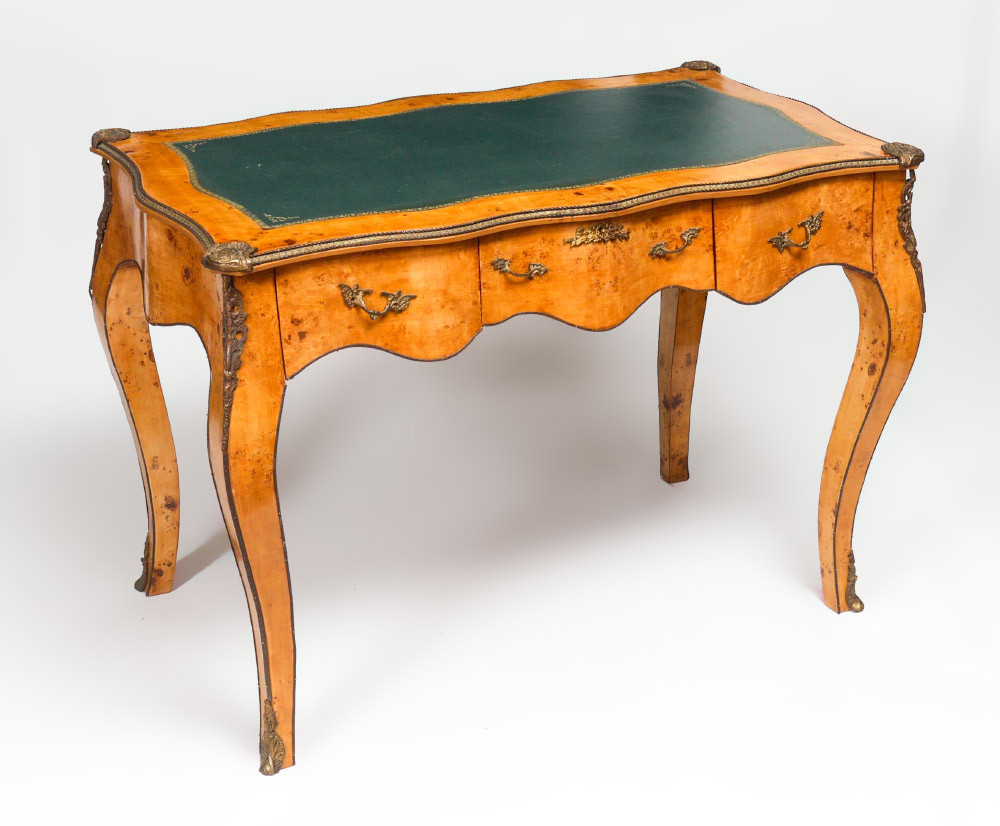 MAPLE FRENCH STYLE WRITING DESK: Embossed inset leather serpentine top with ormolu trim and applied decoration. 3 drawers, shaped legs, overall measures 32 1/2'' x 46 1/2'' x 26''.