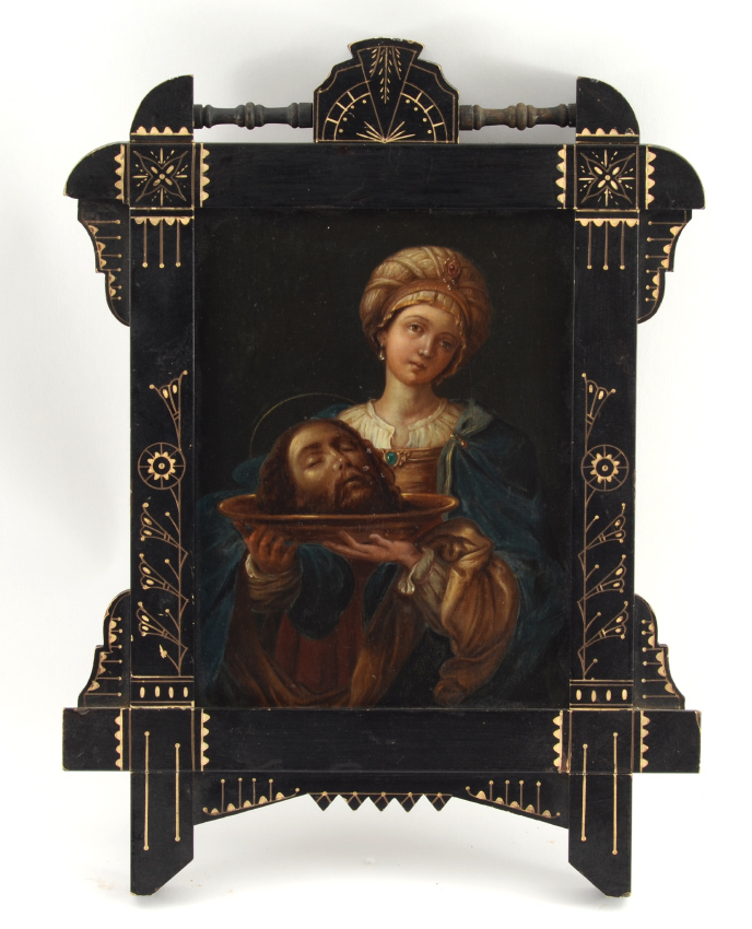 EARLY PAINTING OF SALOME/HEAD OF JOHN THE BAPTIST: Oil/Board, 8 1/2'' x 6 1/2'', no visible signature, excellent carved and ebonized frame, approx. 14'' x 11''.