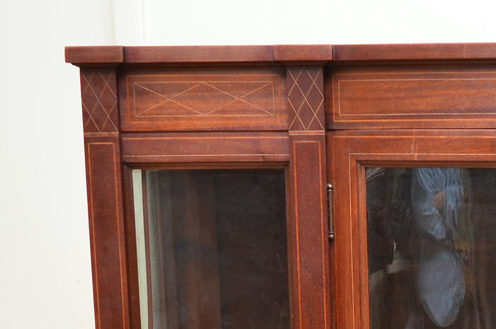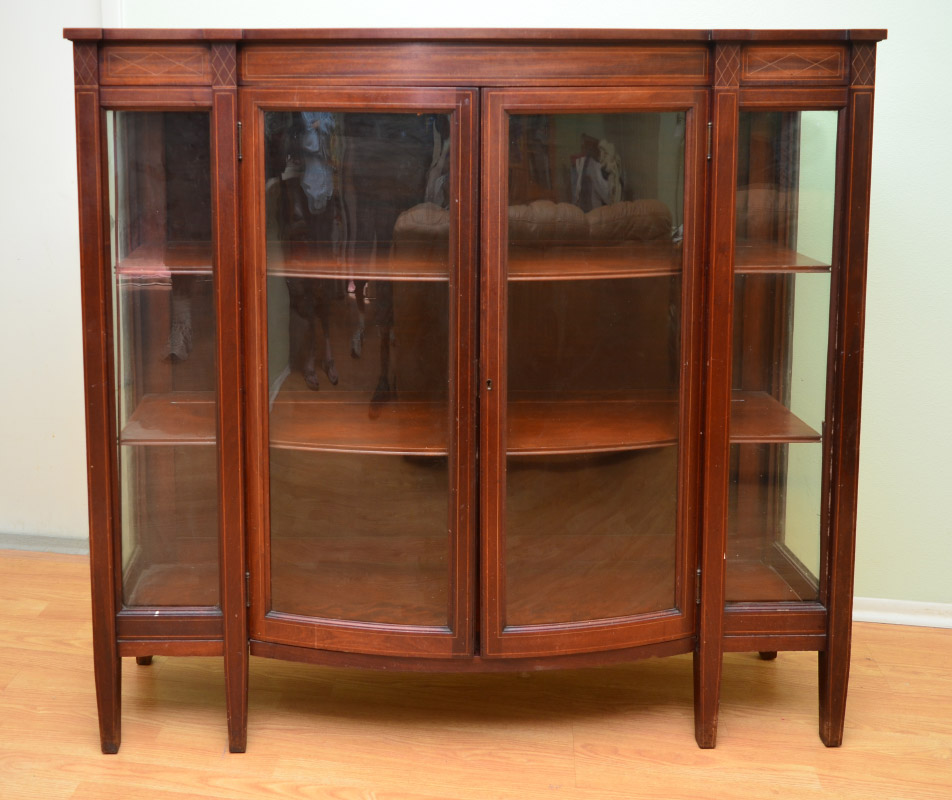 2 DOOR MAHOGANY BOWFRONT CHINA CABINET: Bowfront doors with glass side panels, string inlay case, 2 shaped interior shelves, tapered feet. Overall measures 54 3/4'' h. x 58 1/2'' x 16''.