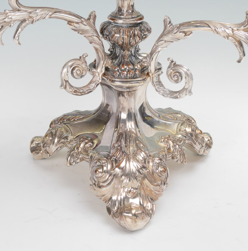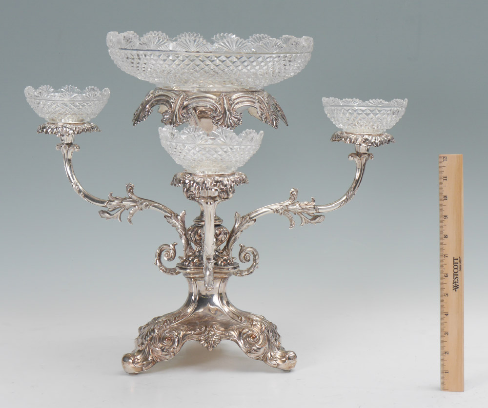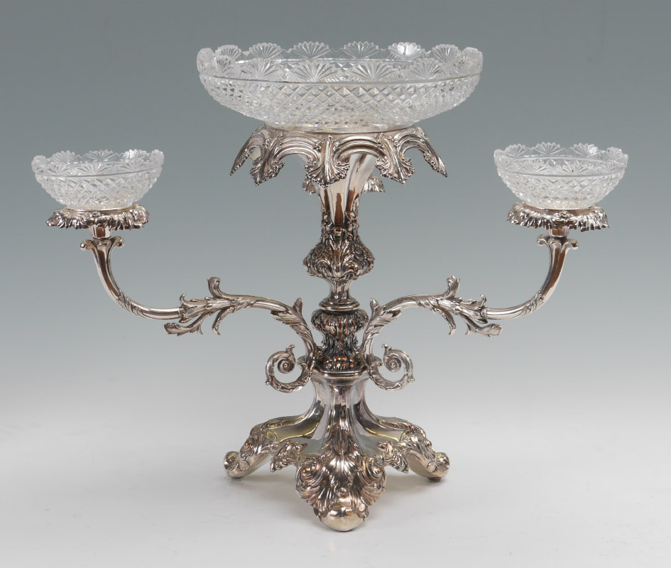 VICTORIAN SILVER PLATE CUT GLASS EPERGNE: 3 arm silver plate floral motif body with floriform bobeches, 15 1/4'' h . x 20''. 4 matching cut glass bowls, center bowl 4 1/8'' h. x 11 1/2'', side bowls 2 1/2'' h. x 5''.