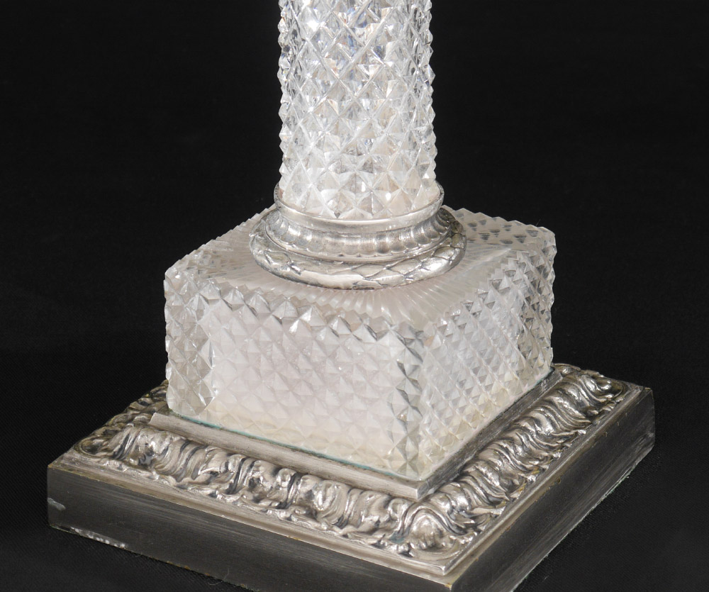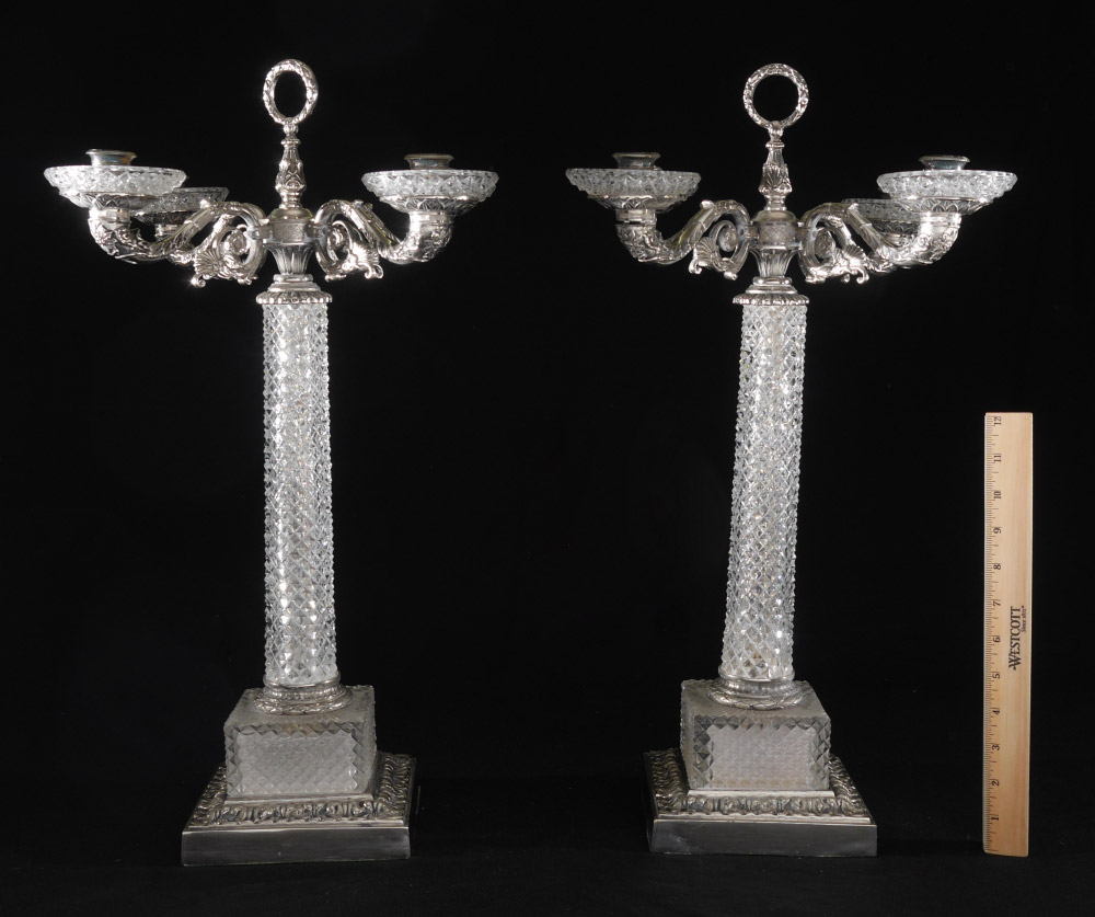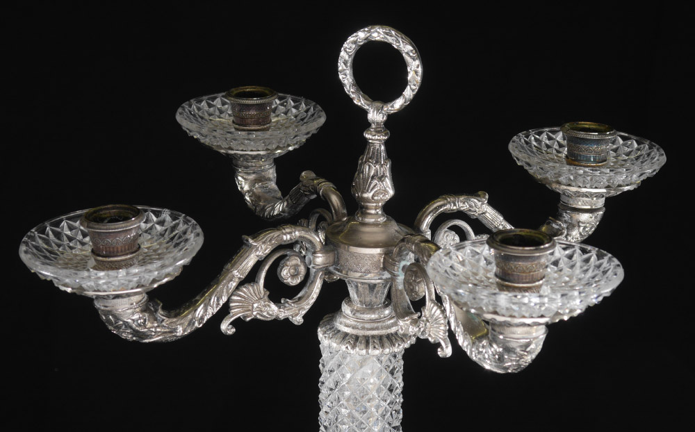 FINE VICTORIAN CUT GLASS SILVERPLATE CANDELABRA: Silverplate 4 arms with center carrying ring, cut glass bobeches. Diamond pattern column cut glass body over stepped square base with matching cut glass. Overall measures 22'' h. x 14 1/2''.