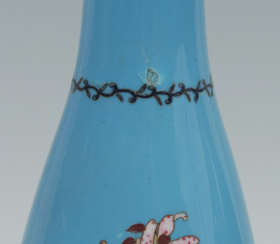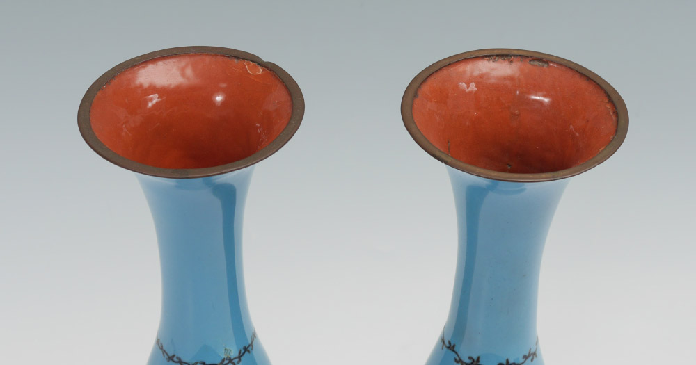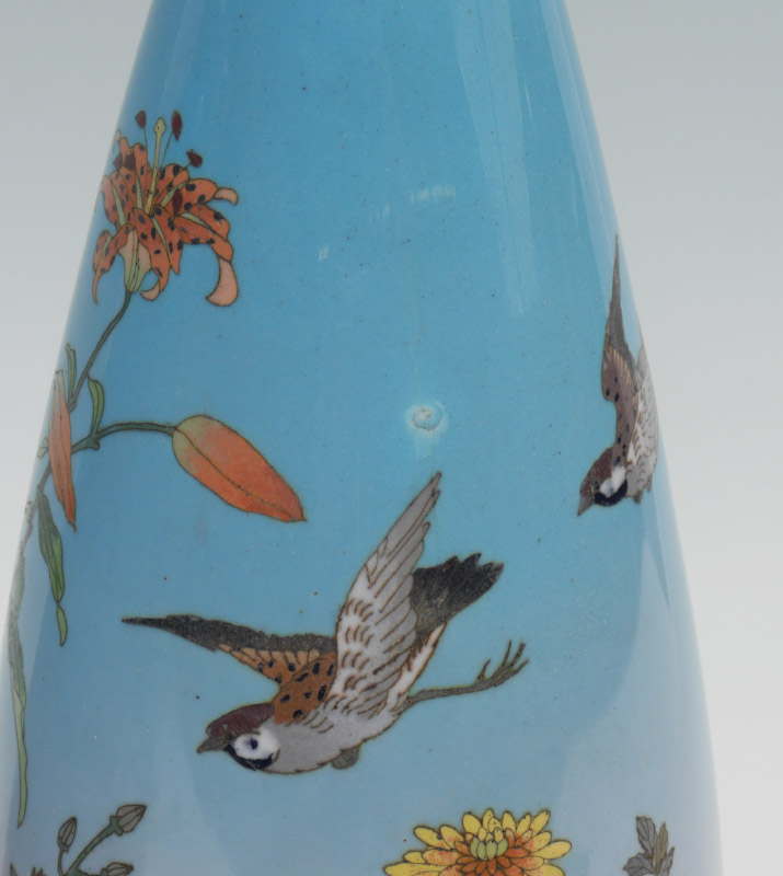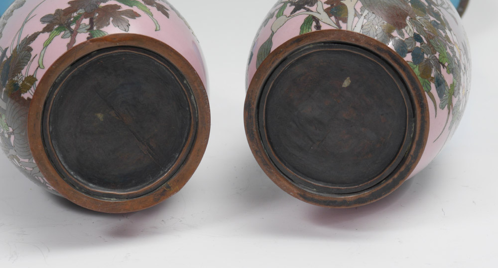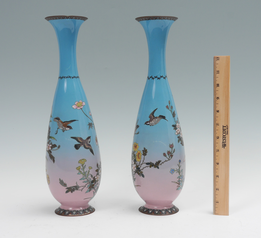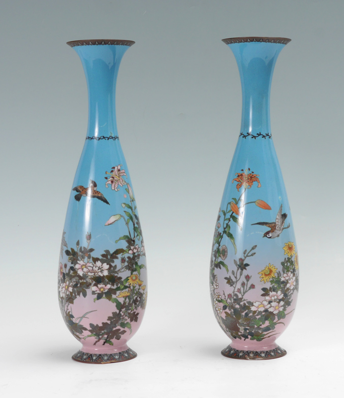 PR HIGH QUALITY MEIJI PERIOD CLOISONNE VASES: Robin's egg blue shaded to light pink. decorated with gayly colored floral sprays and bird's in flight. Measures approx. 15'' tall.