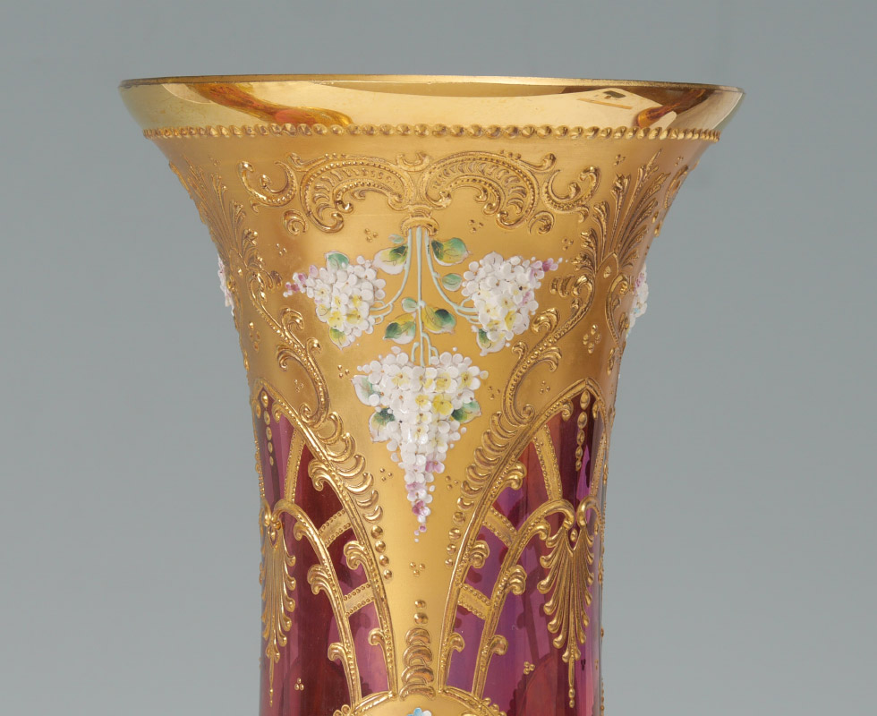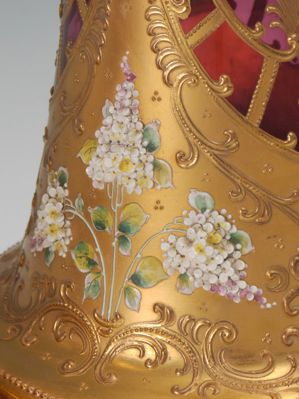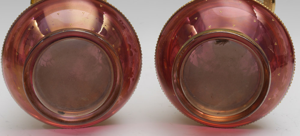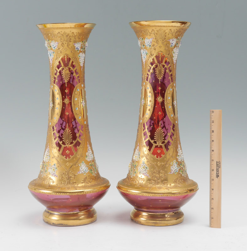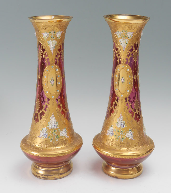 PAIR CRANBERRY GLASS VASES attrib. MOSER: Parcel gilt with applied enamel decoration. 21'' high x 9'' at the widest.