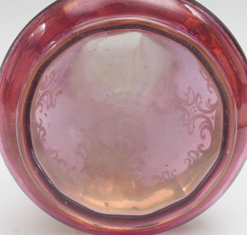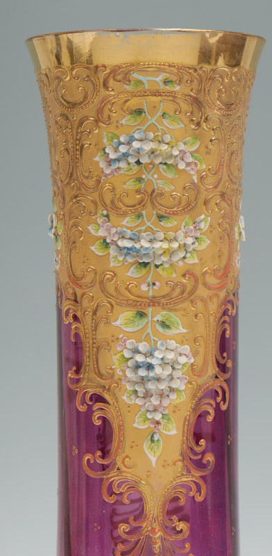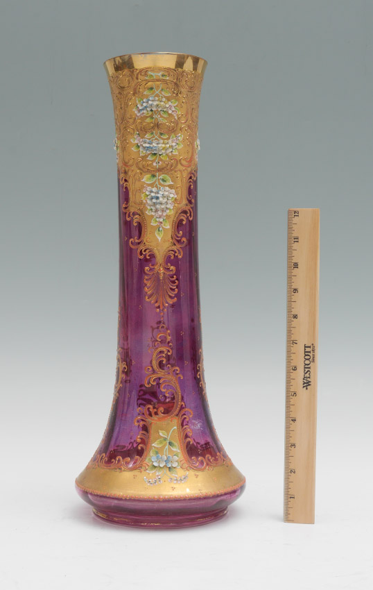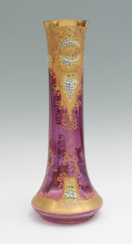 CRANBERRY GLASS VASE attrib. MOSER: Parcel gilt with applied enamel decoration. 18'' high x 6 1/2'' at the widest.