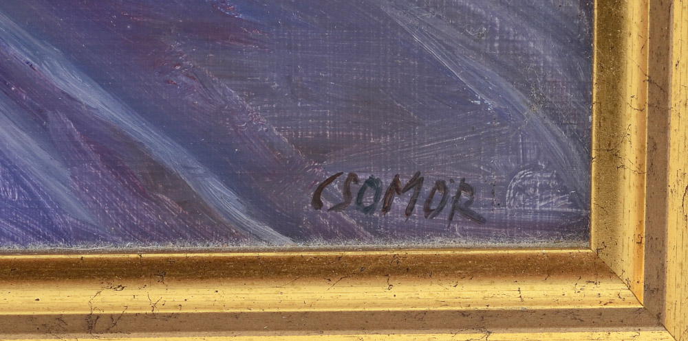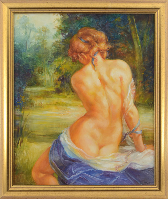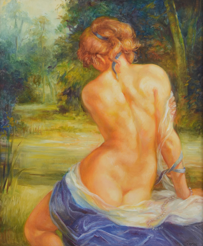 CSOMOR, Katalin, (Hungarian, 20th C): Female Redhead Nude in a Landscape, Oil/Masonite, 24'' x 20'', signed lower right, gallery label affixed verso, dedicated and dated verso 1999, custom frame, 27'' x 23''.