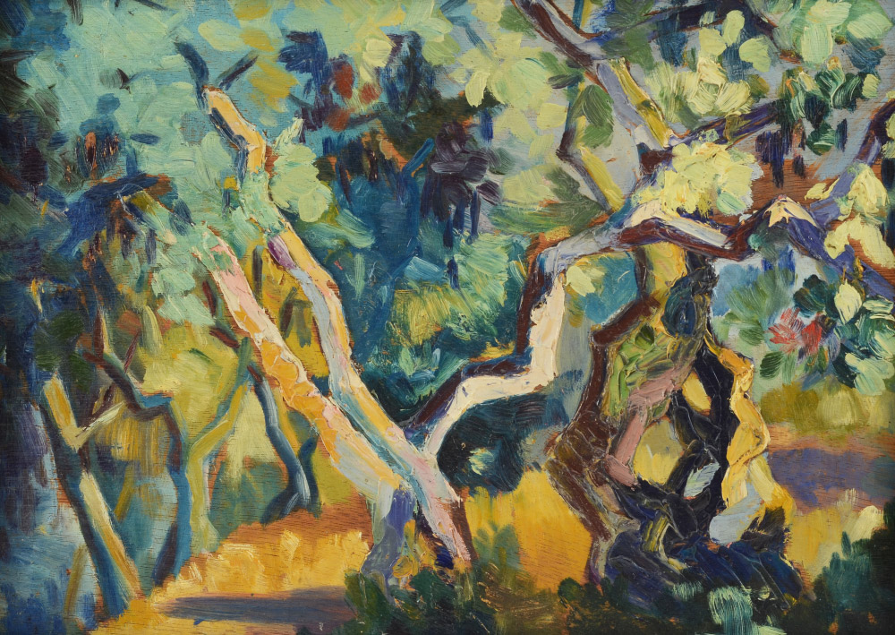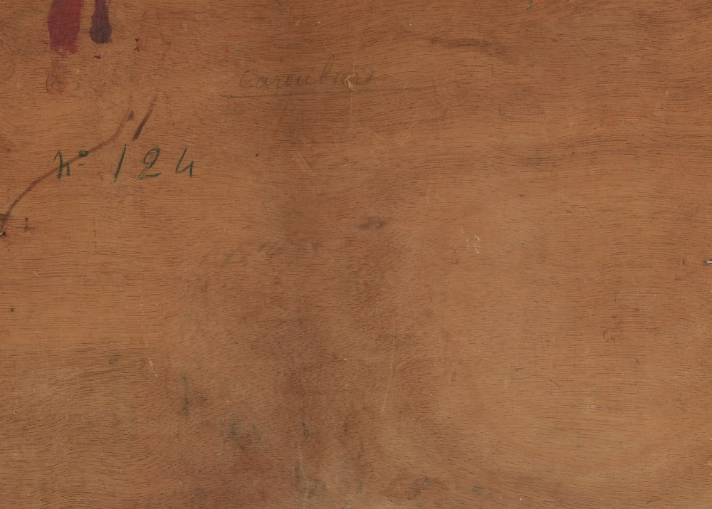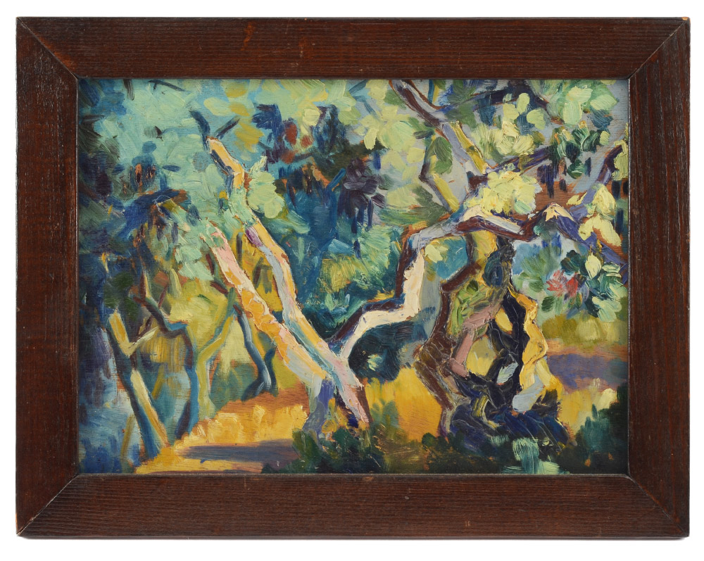 ''CAROUBIERS'' IMPRESSIONIST MYSTERY PAINTING: Oil/Board, 9 1/4'' x 12 3/4'', no visible signature, titled verso and numbered 124, framed, 11 1/2'' x 14 3/4''.