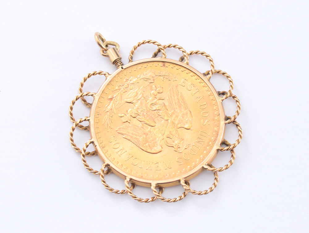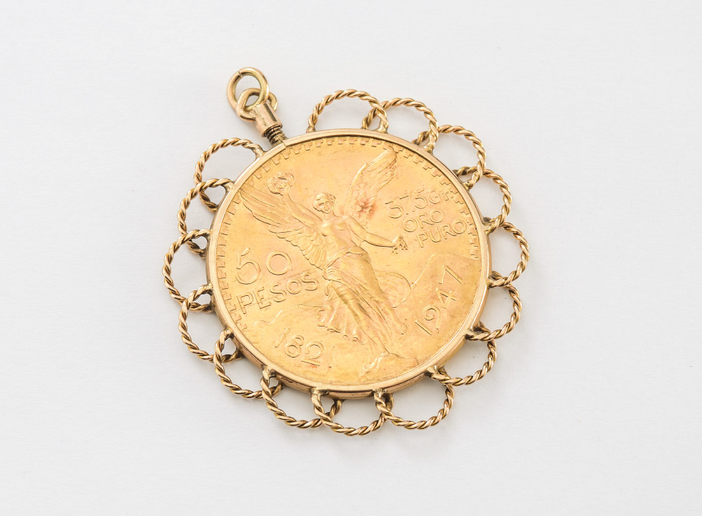 1947 MEXICAN 50 PESO GOLD COIN PENDANT: Ungraded, dated 1947, stamped 37.5 gr. pure gold, set in 14k gold twist wire frame. Overall 46.6 grams (37.5 pure gold, 4.9 grams 14k).