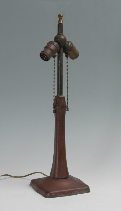 HANDEL BASE FILIGREE SLAG GLASS LAMP: Patinated cast metal base marked Handel, original double socket fixture, measures 20'' h. x 6'' square. Sold with an unrelated brass filigree shade with 8 opalescent white glass panels. Shade overall 9'' h. x 15 3/4''.