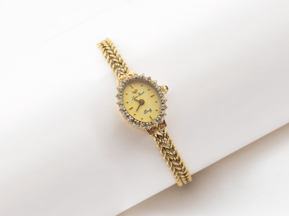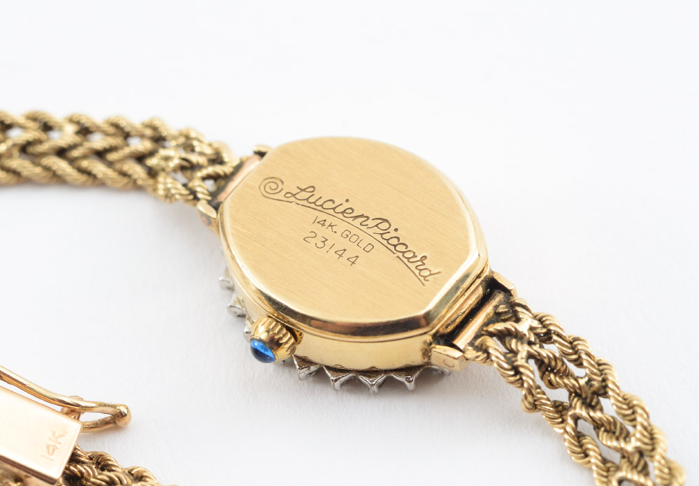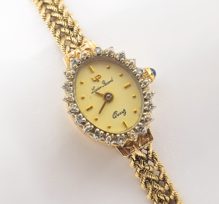 14K GOLD LUCIEN PICCARD LADIES DRESS WATCH: 14K yellow gold watch and bracelet, diamond bezel frames the cream color oval dial with bar and dot markers. Quartz movement in running order. Length 7''. Weight overall 11.5 grams.